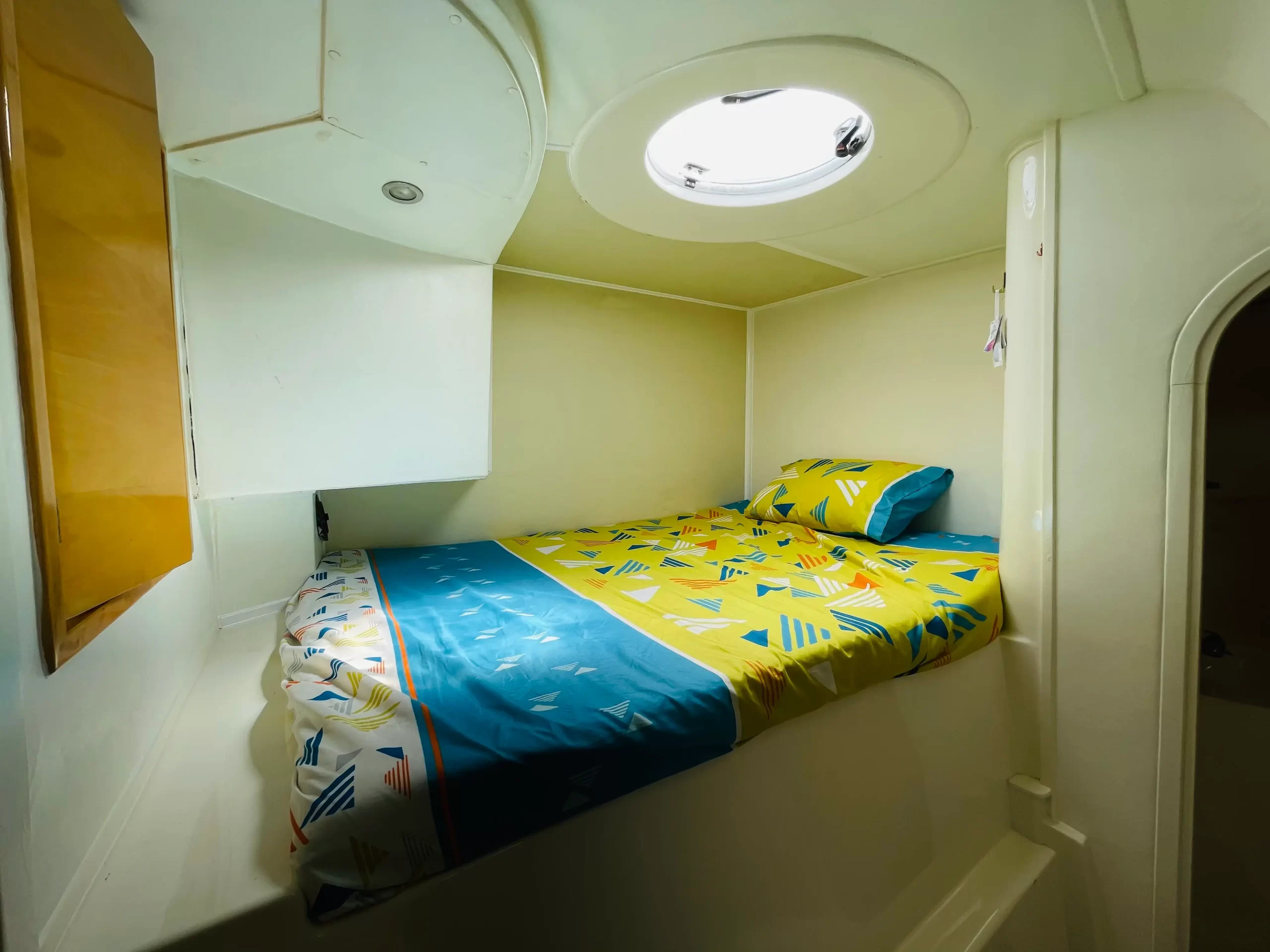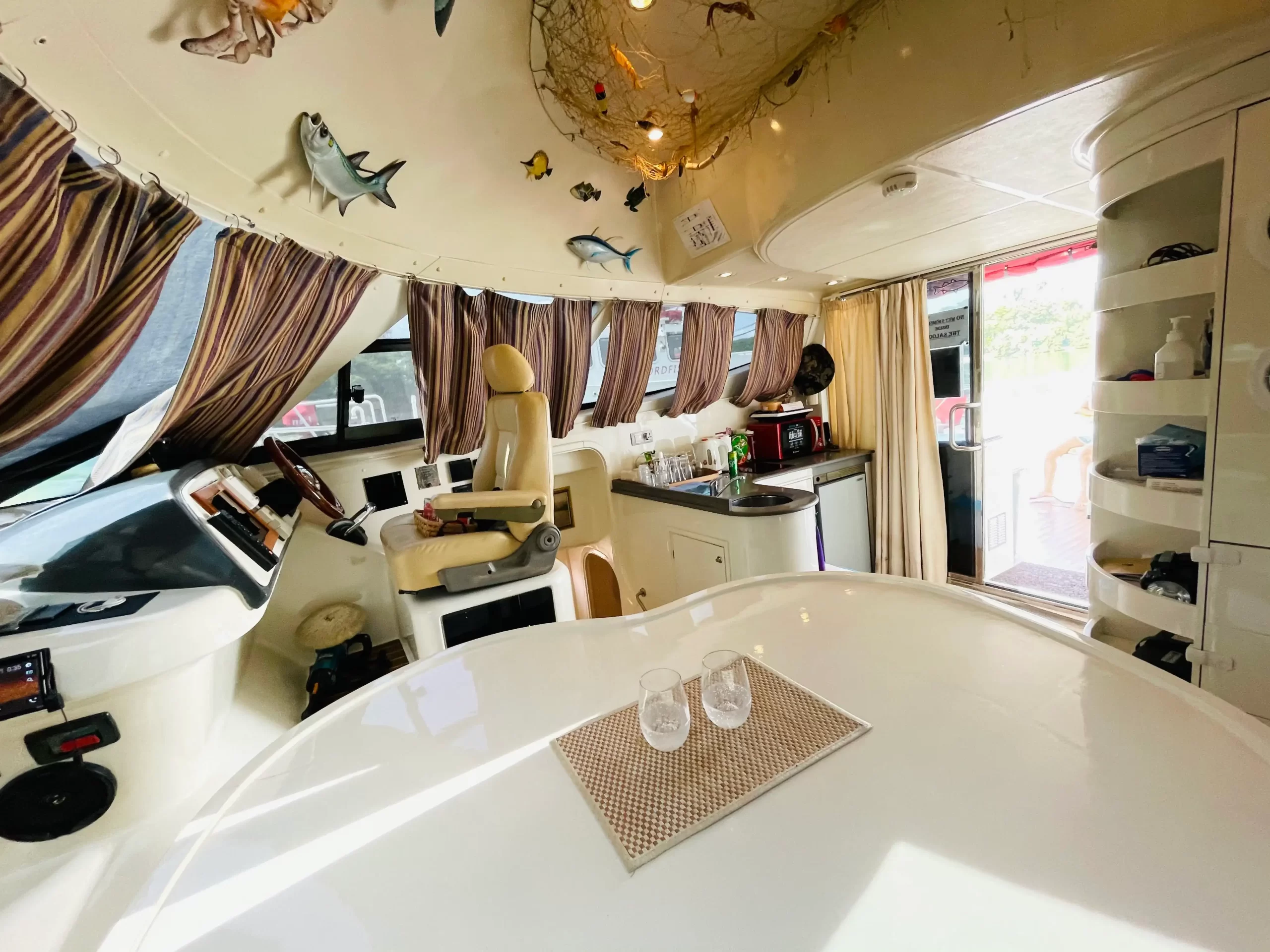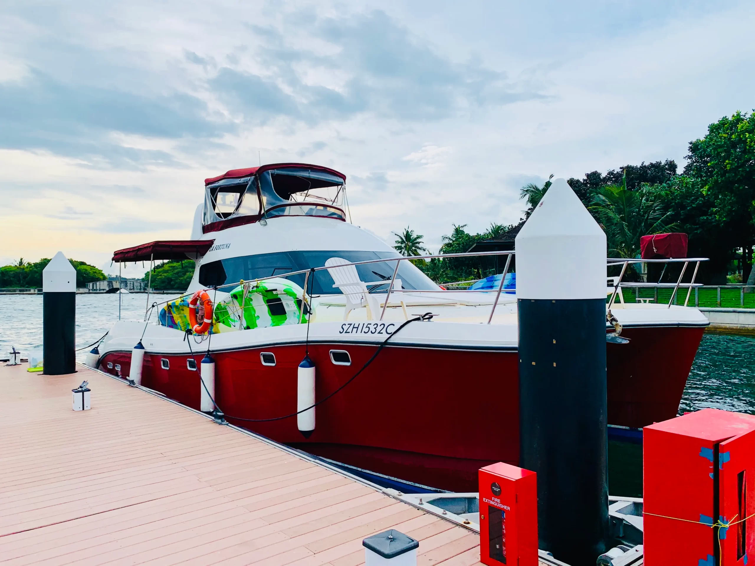 La Fortuna is a 45ft custom build Flash Powered Catamaran specially designed for smooth and luxurious cruising. The deluxe interior boasts finely crafted European style finishing and the saloon has unique visibility thanks to the large windows that surround and envelope the yacht interior making it cozy and optimal for rest while cruising. The yacht comes with large arf and front open deck featuring a modern and spacious open plan saloon and huge amount of outdoor space for alfresco dining, relaxing or entertaining. On the upper level, there is a large flybridge area with a bimini and sun pads–great area to enjoy the view while cruising and for soaking up the sun. Whether it’s for corporate event, family get-together or chilling-out with friends, La Fortuna is perfect for a day of cruising and entertainment out at sea.