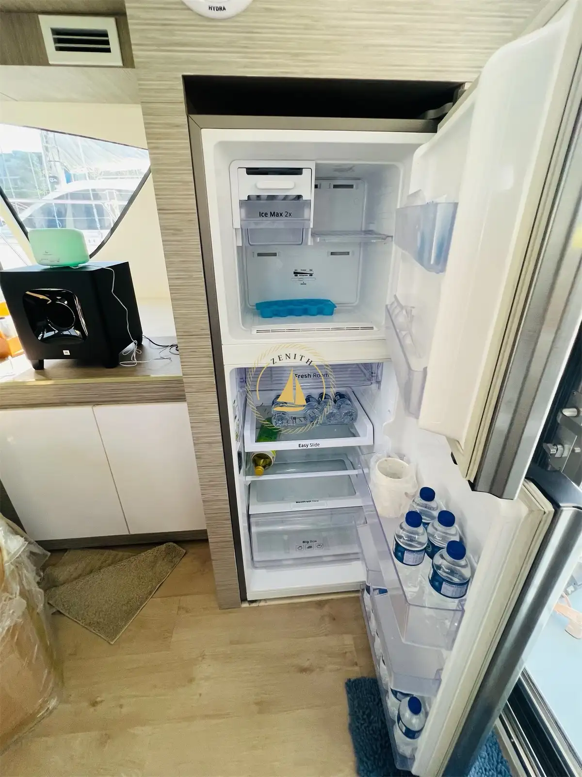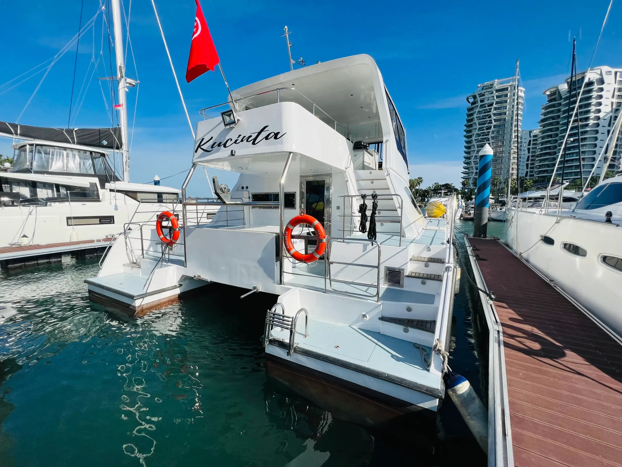 It’s a beautiful power catamaran which is licensed for up to 42 guests. It boasts of panoramic windows with a huge indoor saloon and an equally huge flybridge which can easily seat 15-20 pax. The yacht is also equipped with a full surround sound and karaoke system. Very suitable for large groups and corporates.
