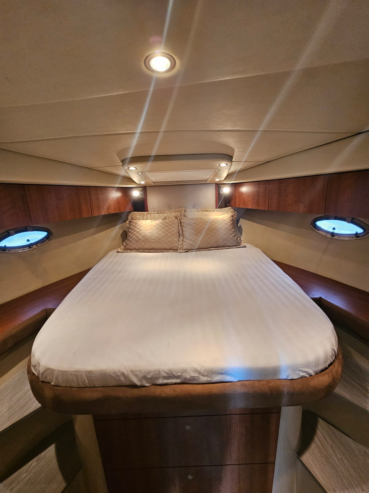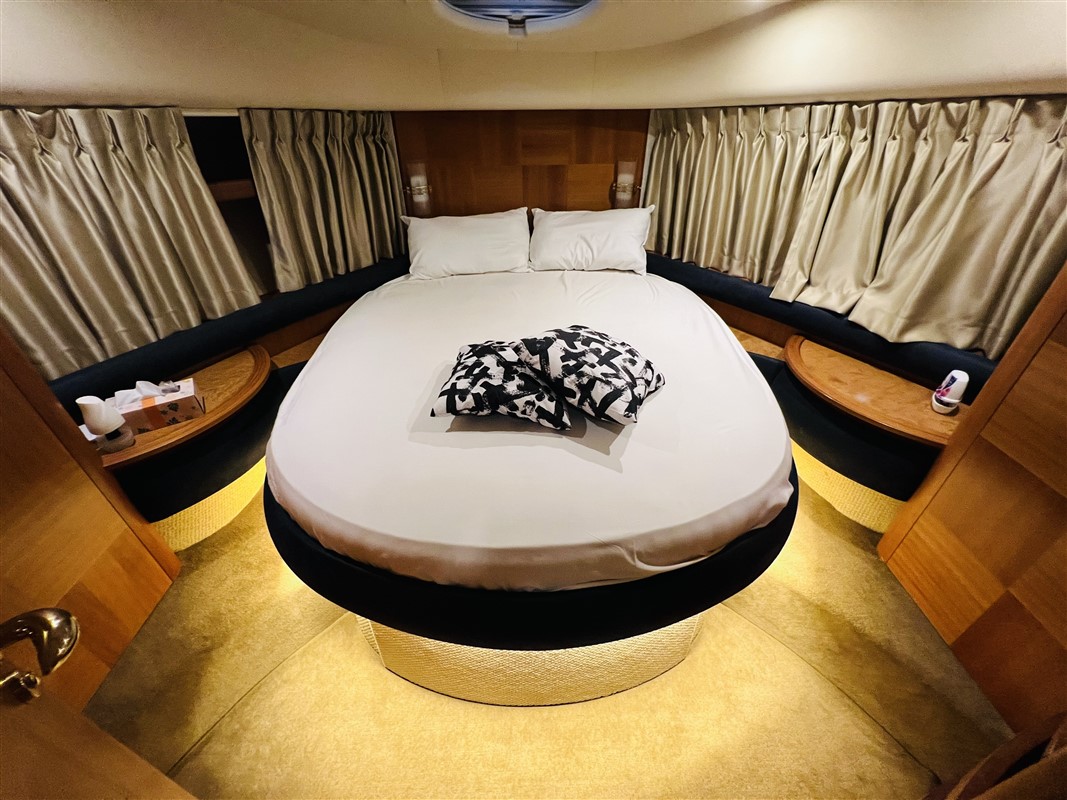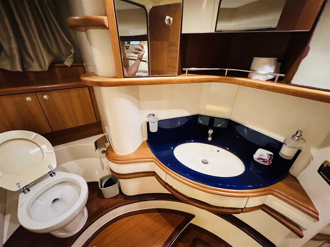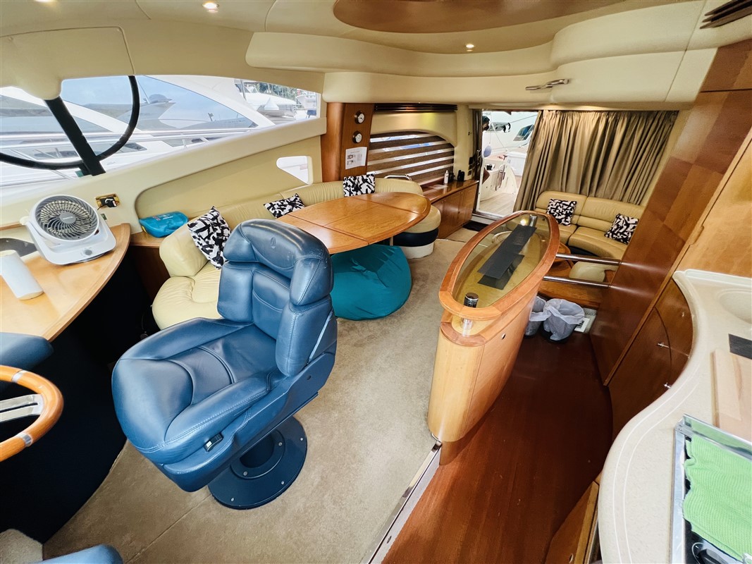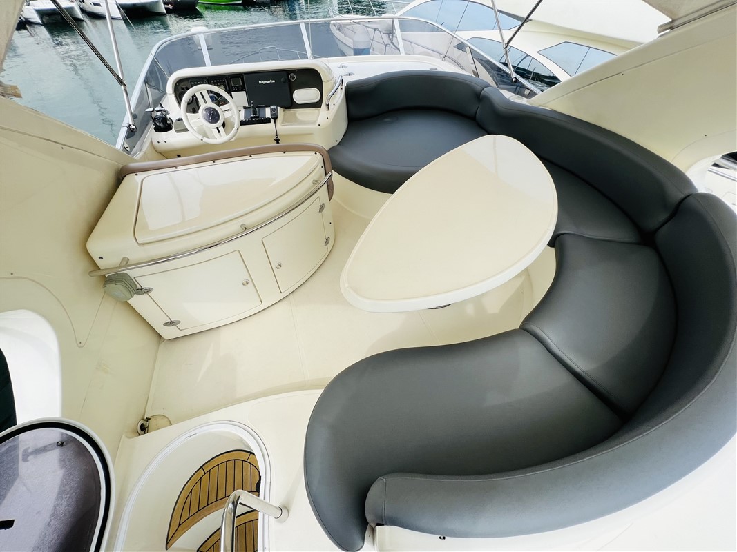 The spacious interiors can comfortably accommodate families or groups of friends with two cabins, six berths, and two bathrooms. The sedan cruiser design is engineered for versatility, while the dual IPS600 Volvo Penta engines ensure a riveting performance. The coveted feature is the flybridge, providing an elevated vantage point for navigation and relaxing with panoramic views.