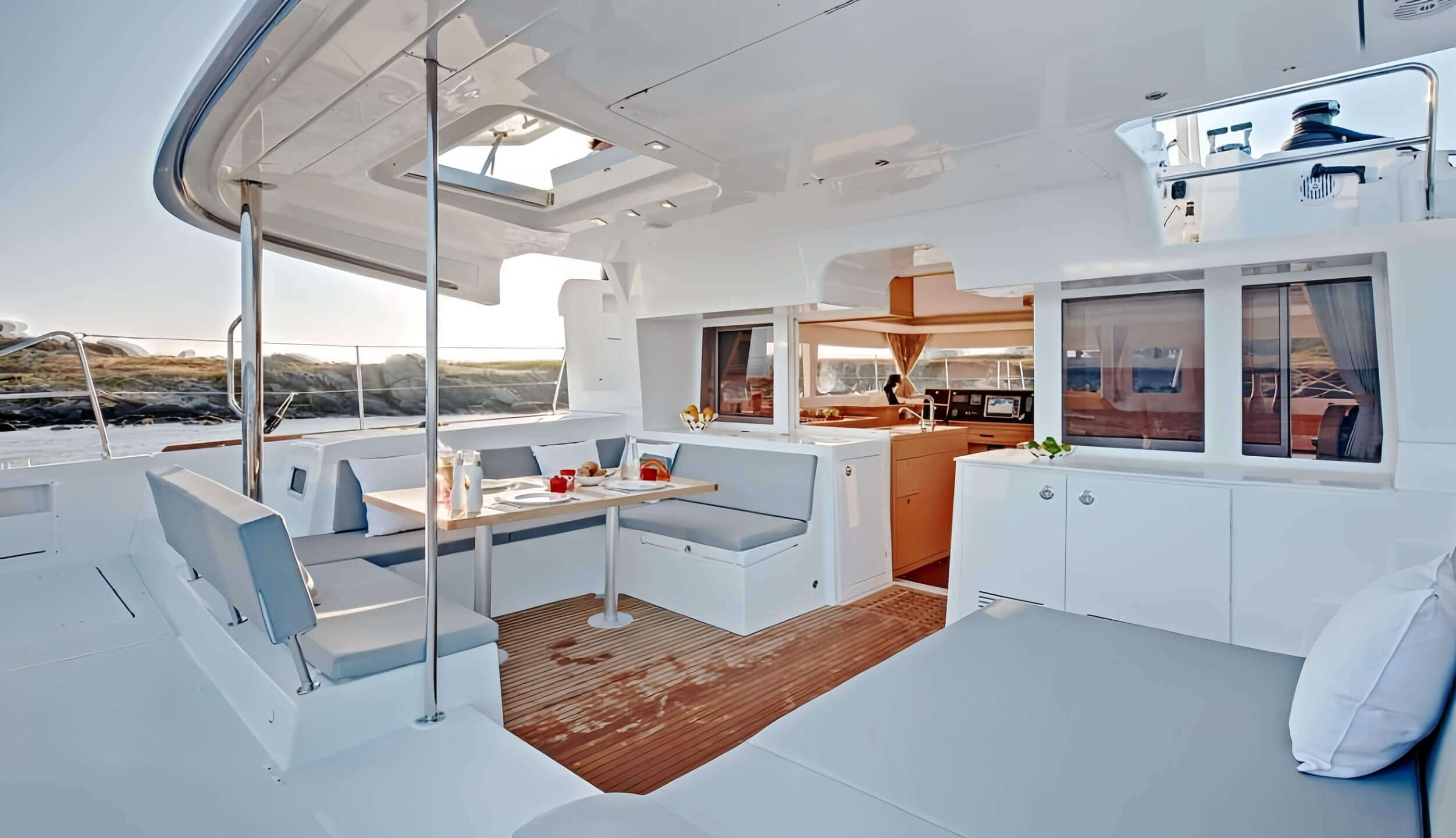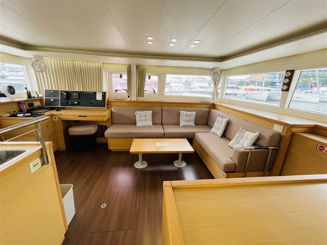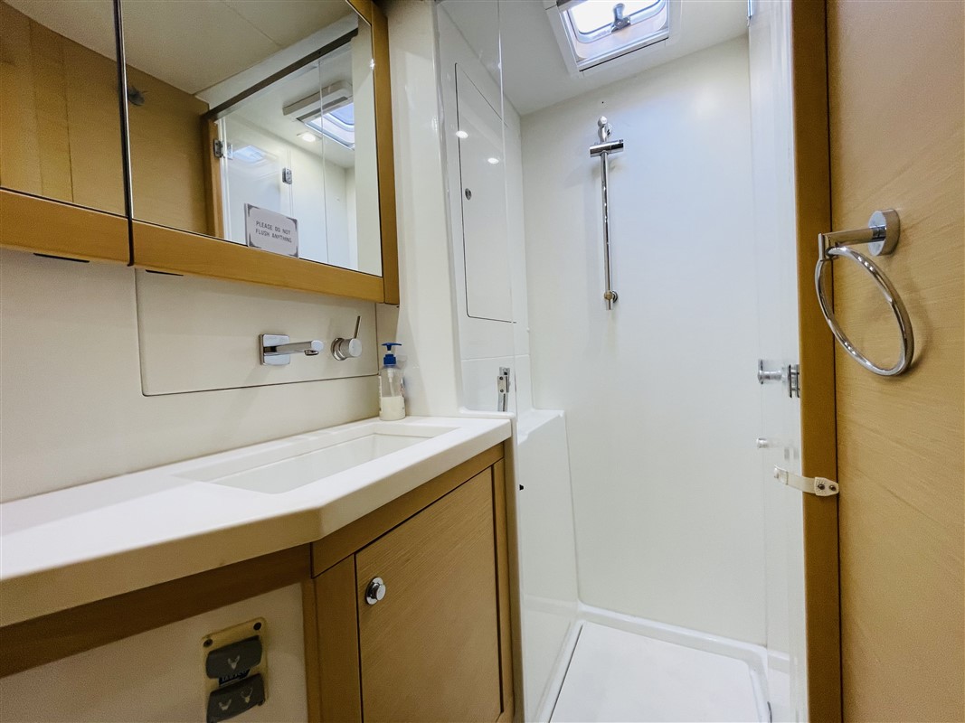 This 4 cabin/4 head layout provides plenty of room and privacy down below. The modern styling and comfortable living spaces make your stay aboard a true luxury vacation. The saloon and galley have large wrap-around windows giving the yacht a light and airy feel, as well as allowing you to take in the scenery no matter where you are on board.