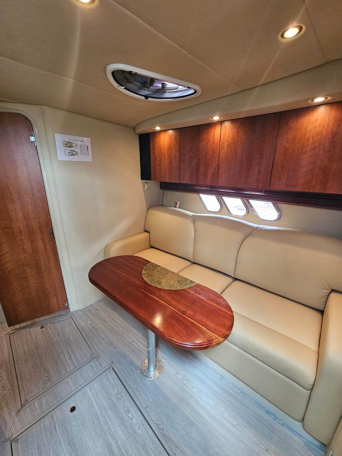 This richly appointed family cruiser is agile, roomy, and extremely well finished. Her impressively stylish, full-width salon includes a spacious galley, a forward stateroom with a privacy curtain, and a U-shaped rear lounge (with table and storage) that easily converts into a double berth for guests.