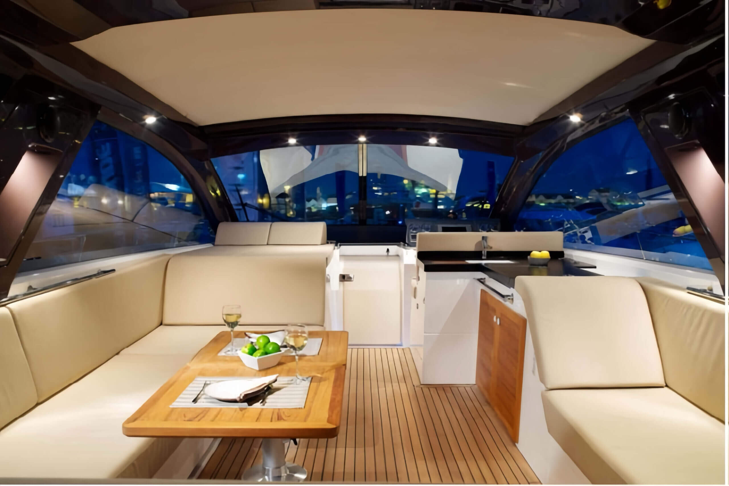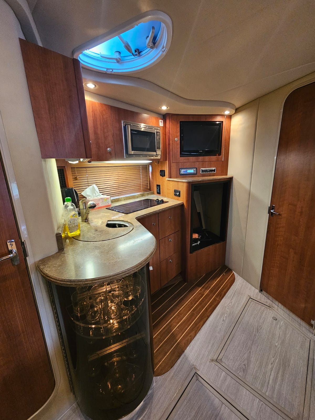 The built-in entertainment center and space-saving rectangular dinette make dining a breeze. The Cruiser’s roomy, guest-friendly cockpit includes a doublewide helm seat, portside chaise lounge, and circular rear settee with a fiberglass hardtop. The Cruisers Yachts 360 Express is perfect for entertaining guests or enjoying a serene getaway with family and friends.