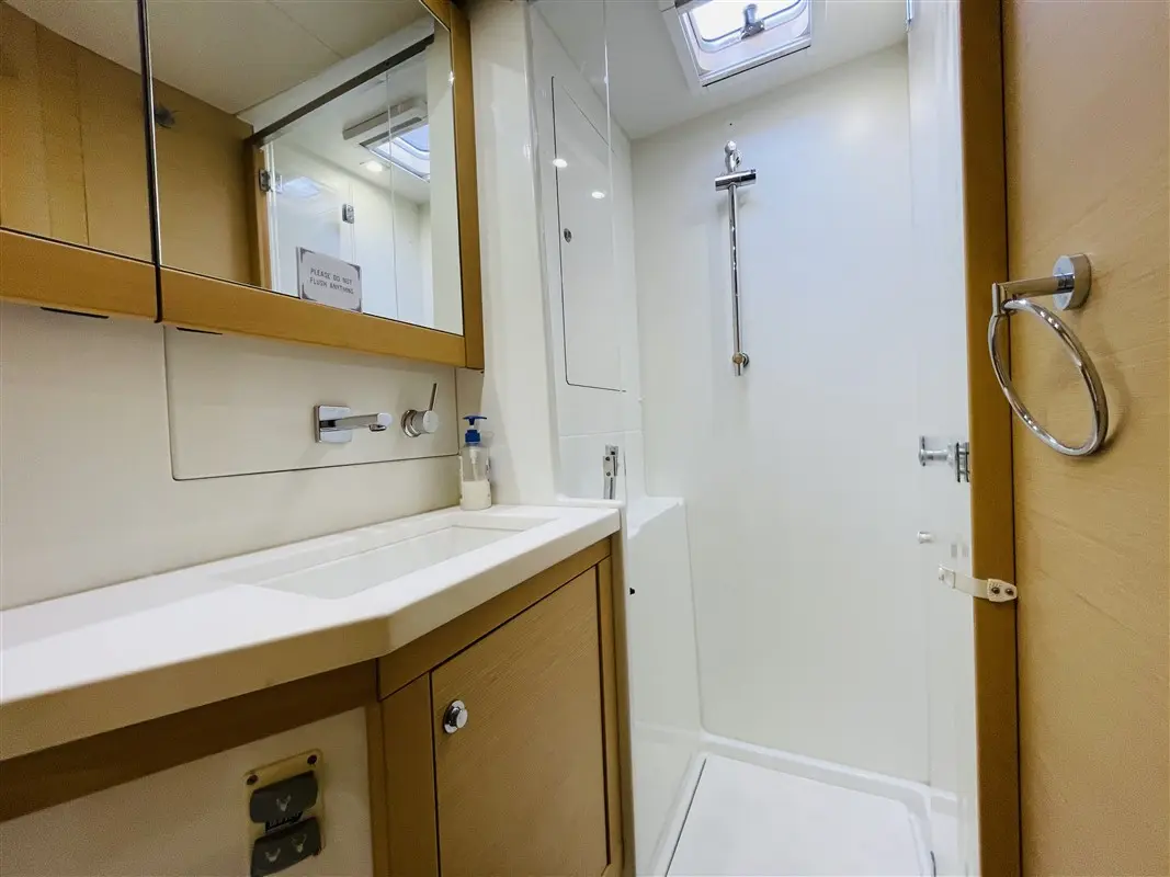 This catamaran is the ideal size with plenty of space both in the interior and exterior of the yacht. It boasts a comfortable charter experience and is still small and nimble enough for easy handling. She can effortlessly house 4 couples or a family and provides all the style and amenities of a 50 foot or larger catamaran. This 4 cabin/4 head layout provides plenty of room and privacy down below. The modern styling and comfortable living spaces make your stay aboard a true luxury vacation. The saloon and galley have large wrap-around windows giving the yacht a light and airy feel, as well as allowing you to take in the scenery no matter where you are on board. The exterior of the yacht is not short on lounging spaces; the aft cockpit is perfect for outdoor dining and relaxing while at anchor, and the cozy flybridge allows whoever is driving to still be a part of the conversation. Let’s not forget the forward cockpit and trampoline, ideal for watching the waves go by and truly enjoying a calm sail.
