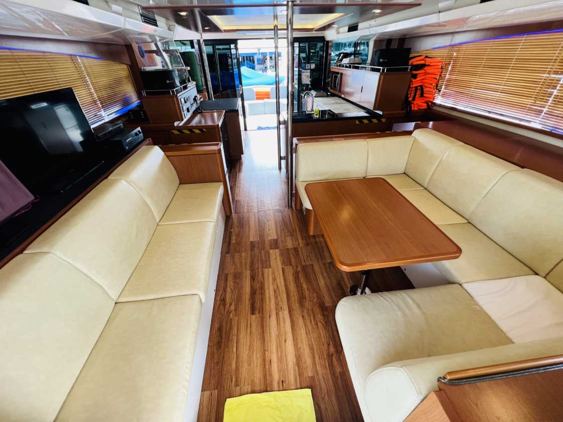 AMETHYST was developed to set a new standard as the state-of-the-art, pure-bred Aquila 48 Power Catamaran with a perfect balance between luxurious comfort and performance. The main deck offers extended spaces for living large, with beautiful panoramic views and access to both forward and aft covered cockpit seating areas. Inside, comfortable saloon seating ensures leisure dining and entertainment. The galley is ergonomically designed with the most modern of appliances, and all the cabins are well lit thanks to their panoramic windows, spacious ensuite bathrooms and showers stalls.