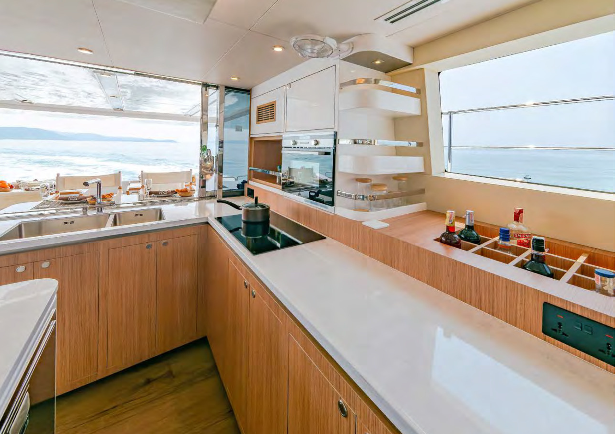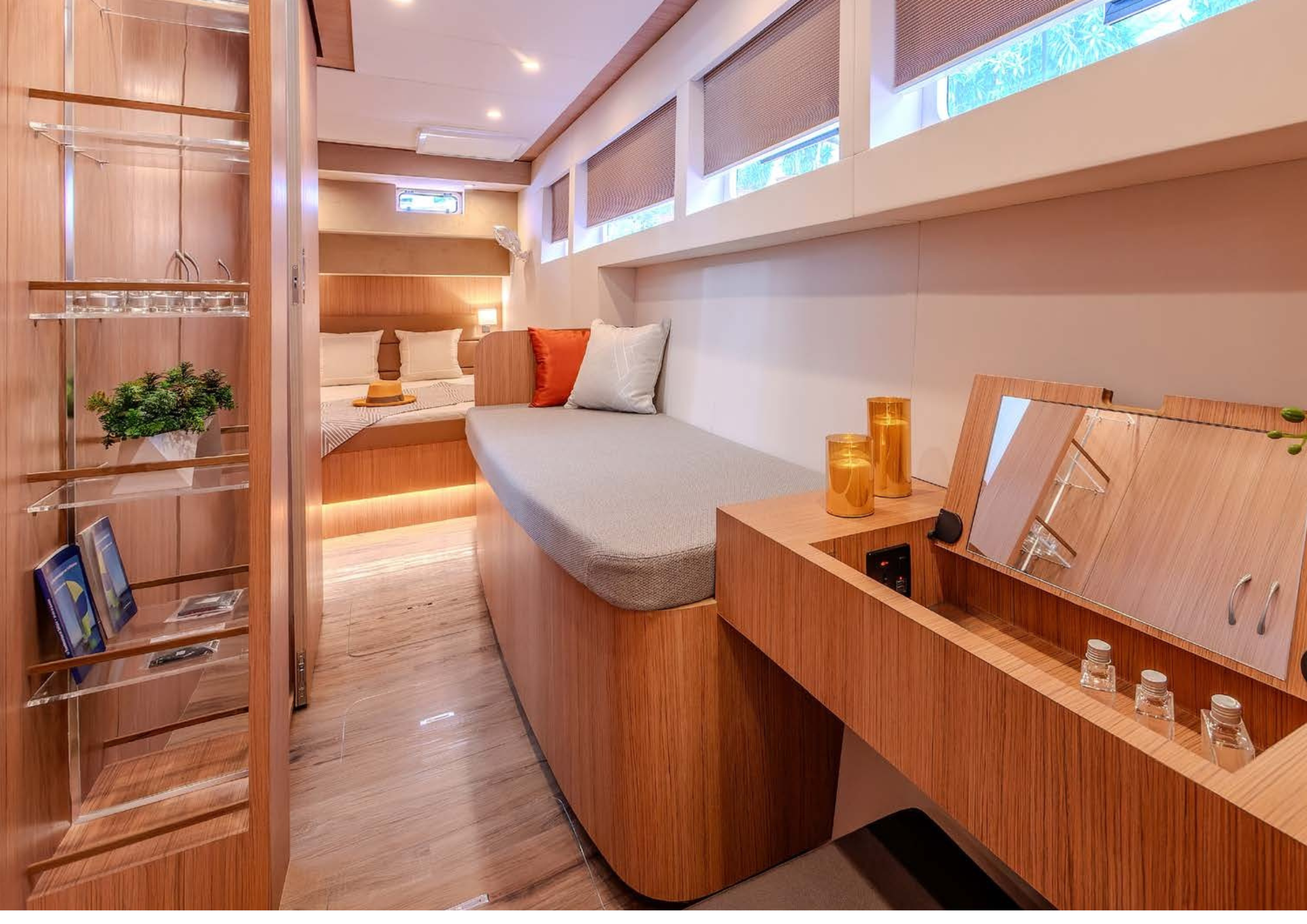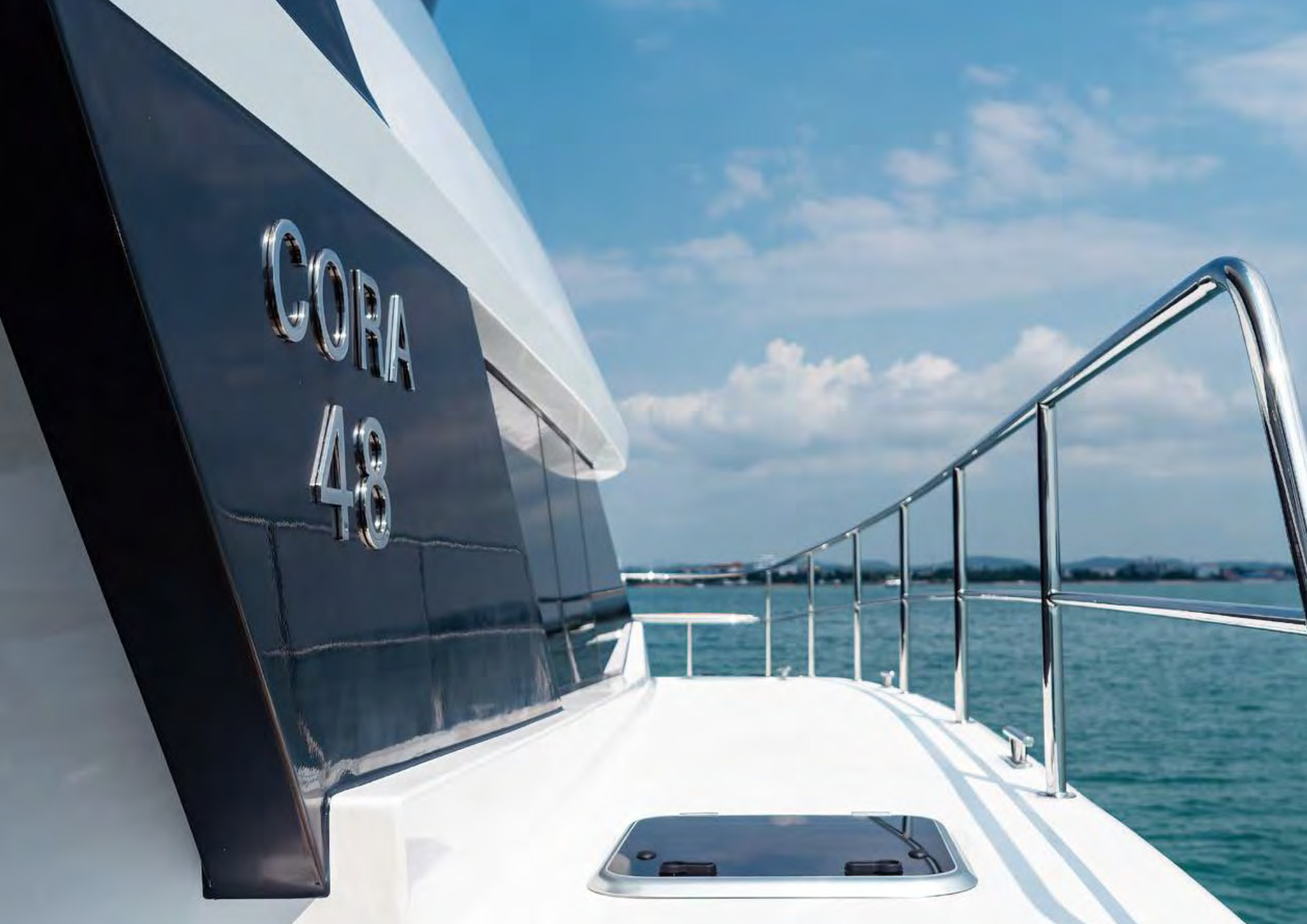 Renowned for its exceptional design, the Cora 48 Catamaran seamlessly combines aesthetics with functionality. The open-plan design integrates the cutting-edge galley with spacious dining and relaxation areas, creating a harmonious ambiance. This allows for effortless transitions from indoor luxury to the sun-soaked exteriors, which boast a vast deck space perfect for any gathering or intimate moment. Embrace alfresco living with a spacious and protected cockpit, bow terrace with adjustable sun lounges, and a superb flybridge incorporating a wet bar, dining and lounge areas.