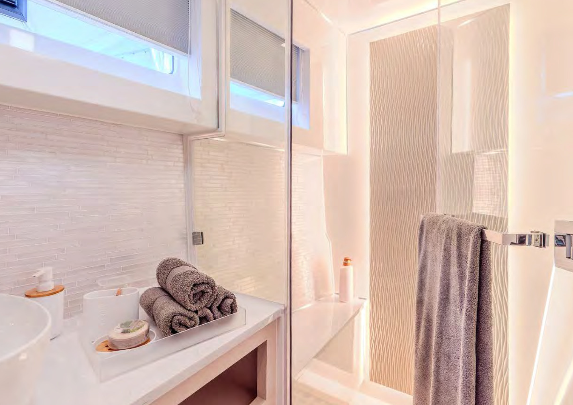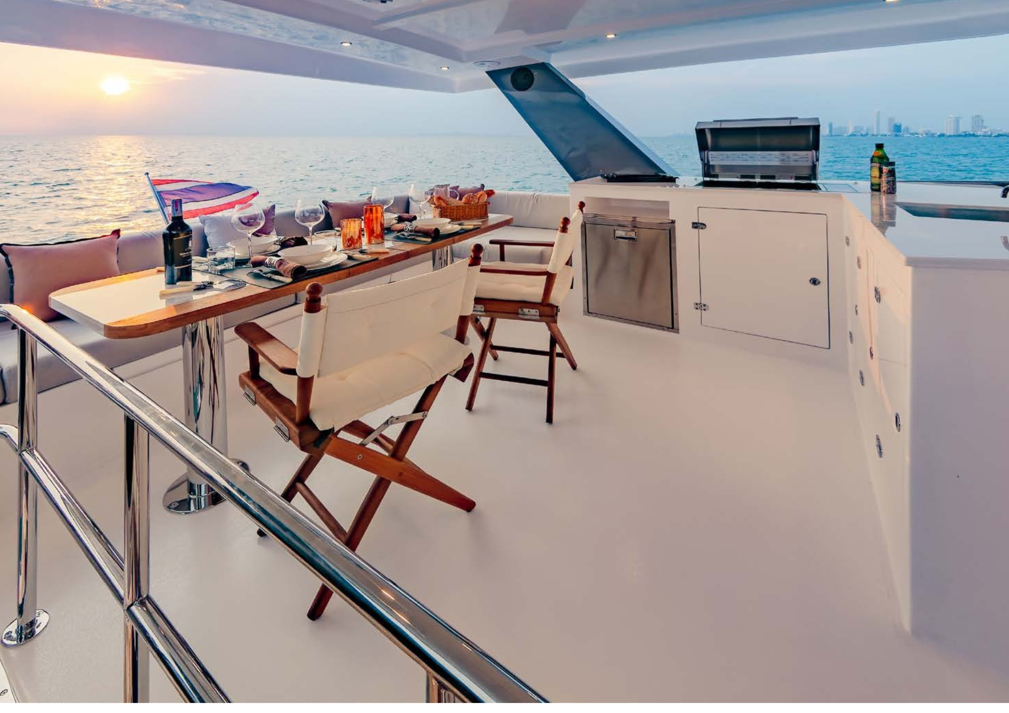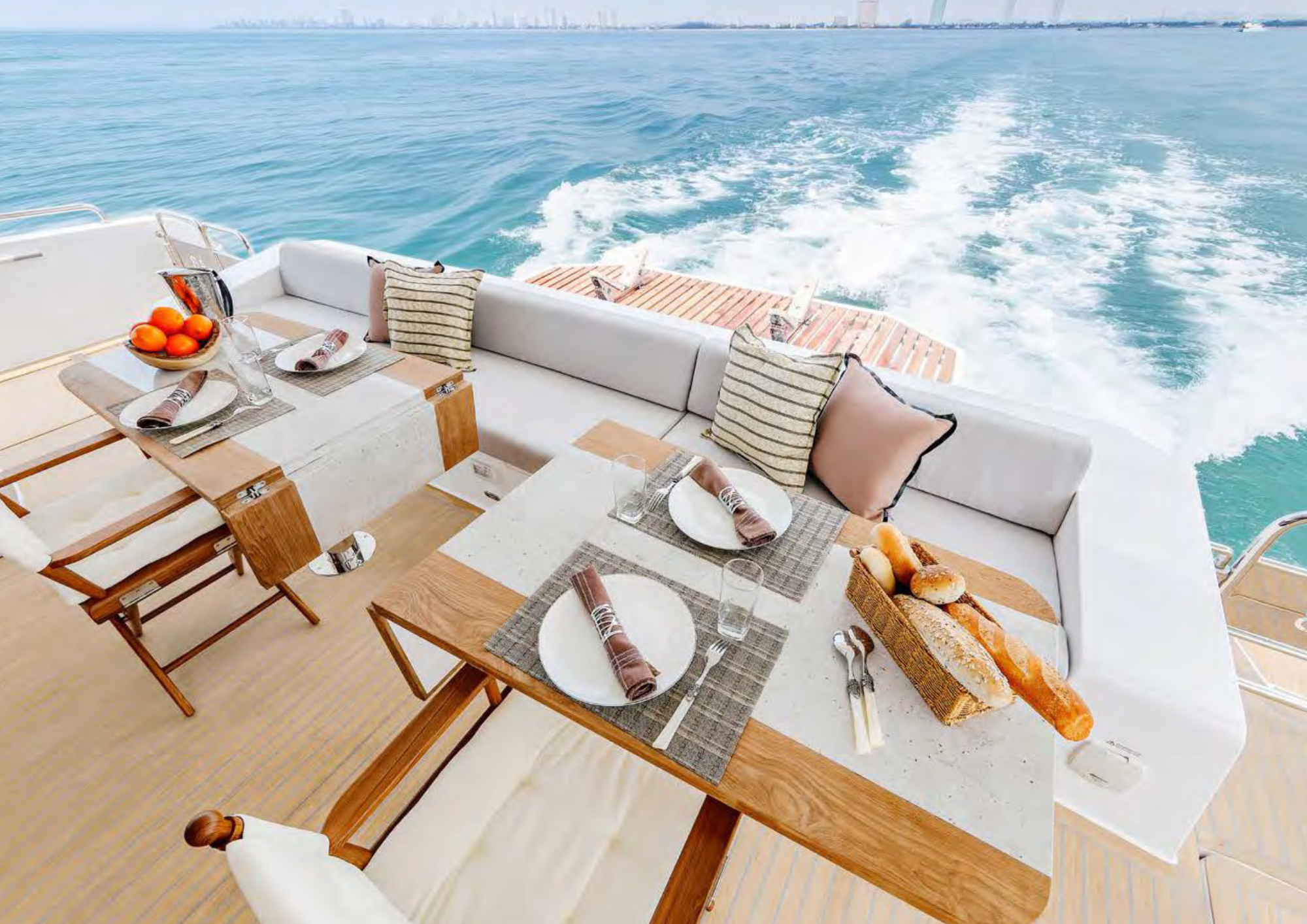 Renowned for its exceptional design, the Cora 48 Catamaran seamlessly combines aesthetics with functionality. The open-plan design integrates the cutting-edge galley with spacious dining and relaxation areas, creating a harmonious ambiance. This allows for effortless transitions from indoor luxury to the sun-soaked exteriors, which boast a vast deck space perfect for any gathering or intimate moment. Embrace alfresco living with a spacious and protected cockpit, bow terrace with adjustable sun lounges, and a superb flybridge incorporating a wet bar, dining and lounge areas.