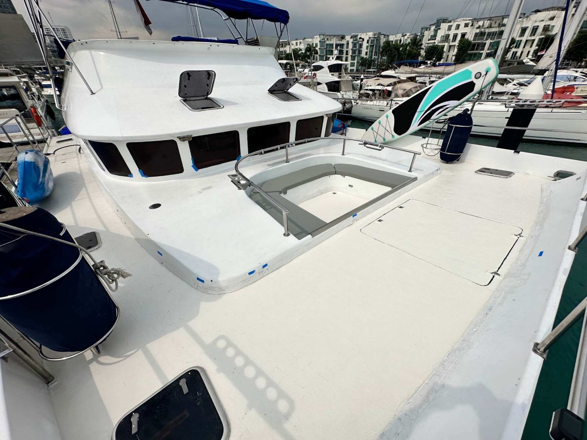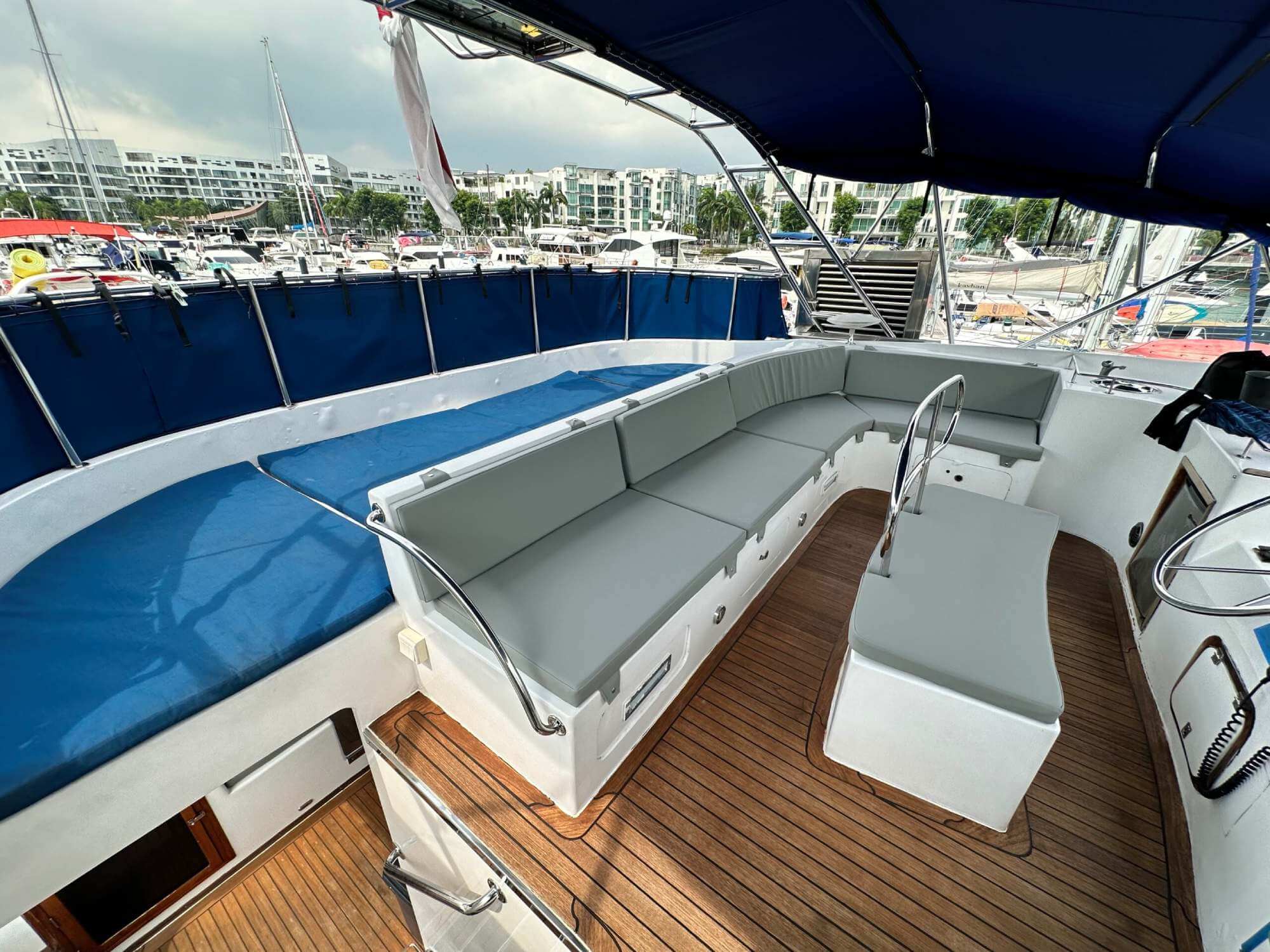 Kingdom is a Majestic Custom Built Power Catamaran, licensed to carry up to 42 passengers (before covid) on private cruises around southern islands of Singapore and extended trips to Malaysia, Indonesia or Thailand. Kingdom is equipped with an air-conditioned saloon that can comfortably house up to 8 guests with direct access to the outdoor dining table. The outdoor saloon is a large area that can provide guests a sheltered area for dining, chit-chat and other activities. At the bow of the yacht lies the front deck with bean bags, which is a perfect spot to chill out and enjoy the refreshing sea breeze while sailing.