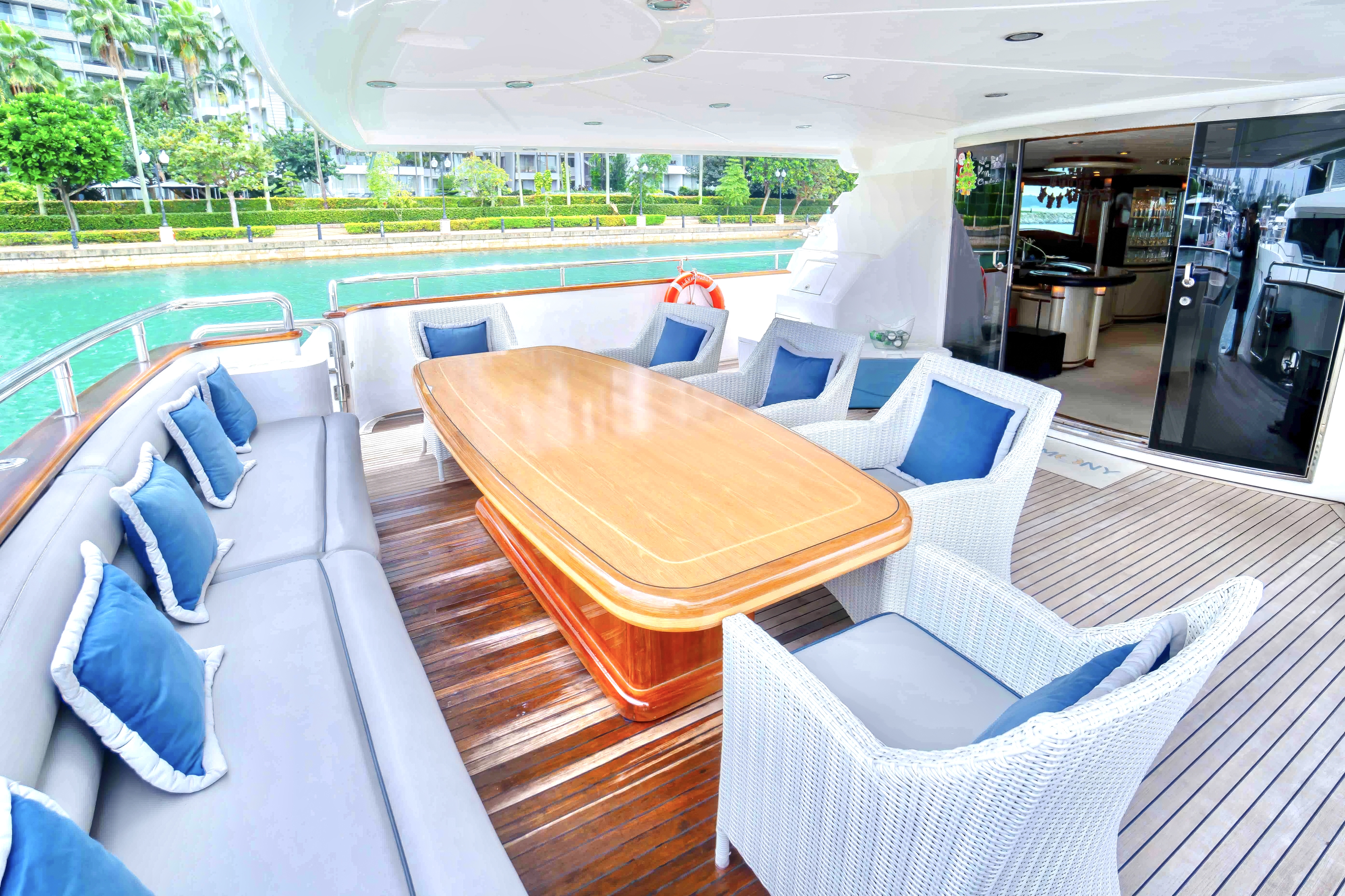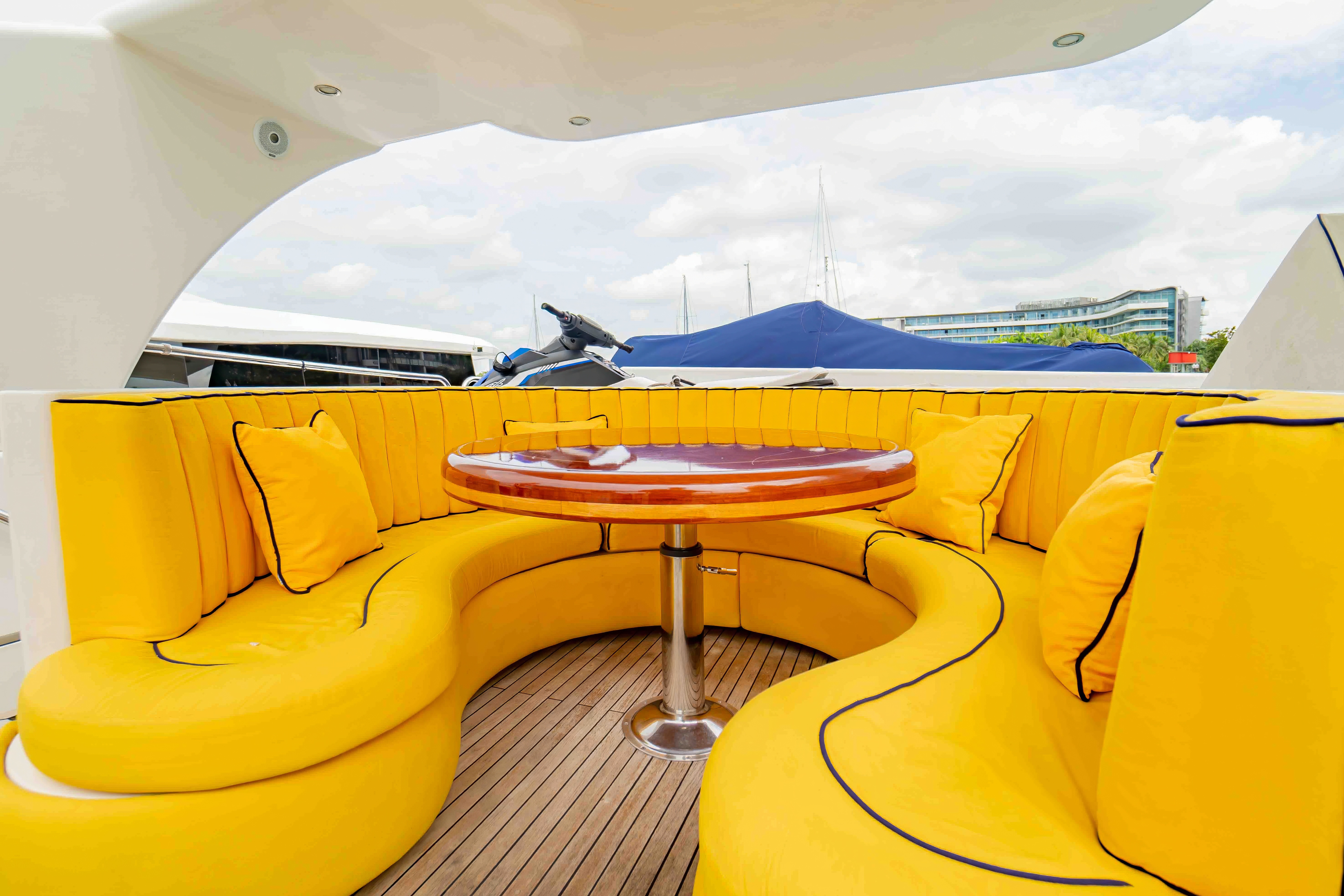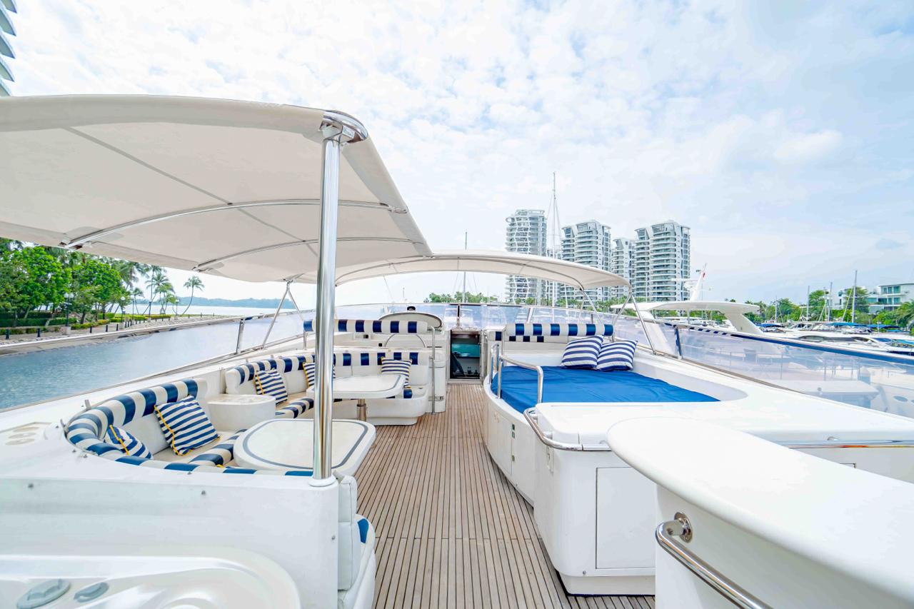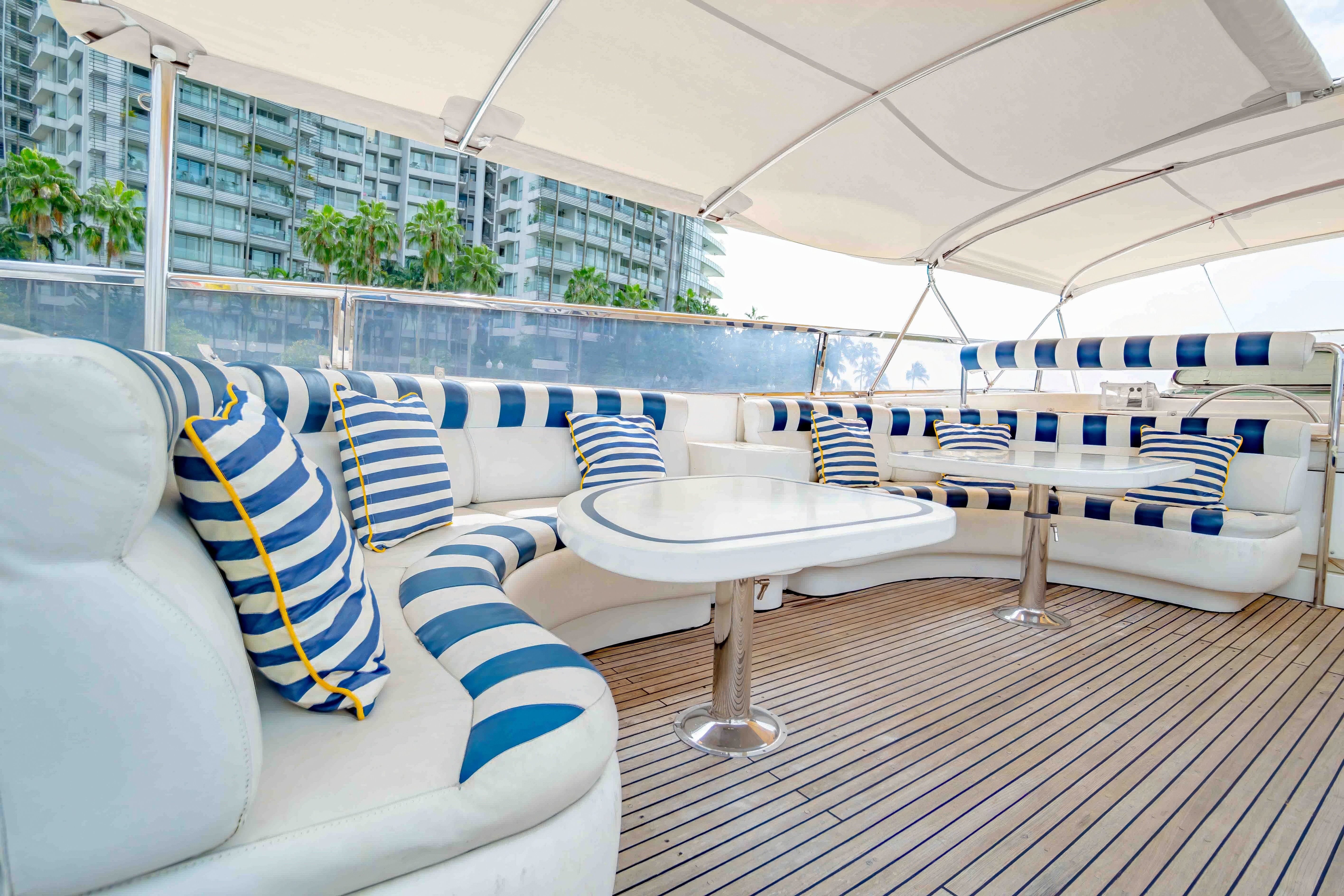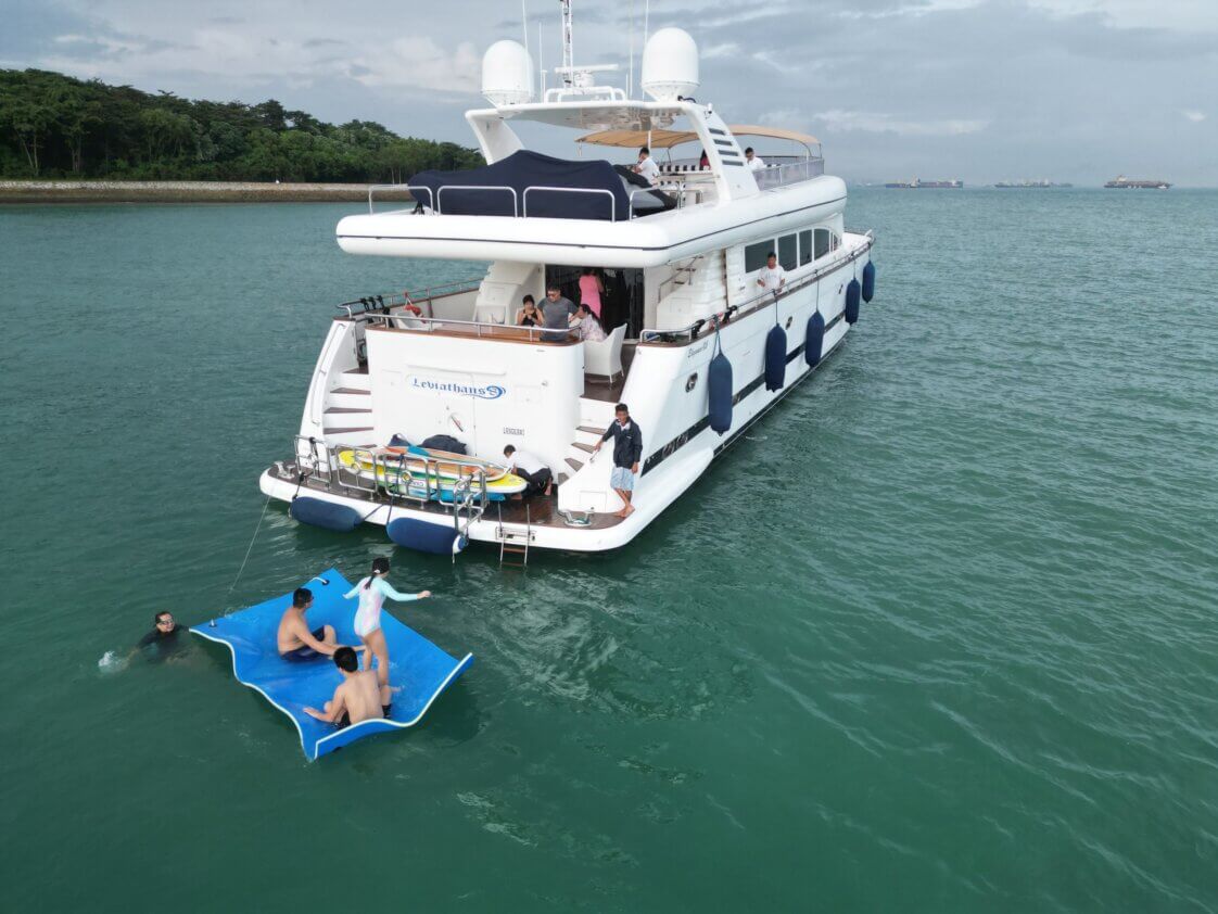 The Leviathan 8 yacht is a 105ft luxury yacht in Singapore boasting a very spacious flybridge to soak up the sun, cruise around Singapore’s sparkling seas, dip in the Jacuzzi, or sit and enjoy the views under the shade. Filled with toys, top quality service provided by her highly-praised and professional crew. Leviathan 8 offers accommodation for up to nine guests in five staterooms. The master stateroom is located forward on the main deck and a curved staircase takes you down to the vanity and large en suite bathroom featuring a Jacuzzi tub and shower.
