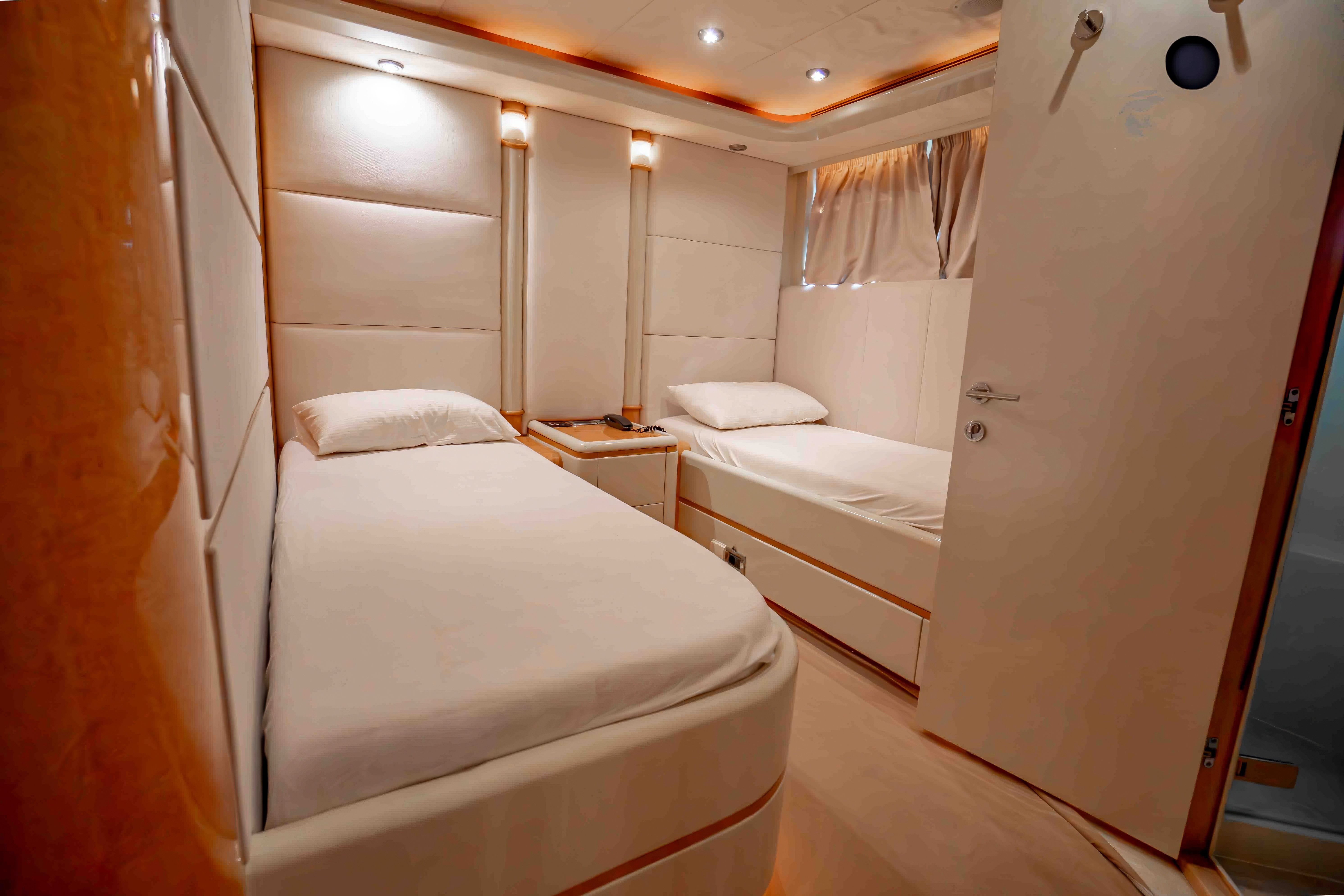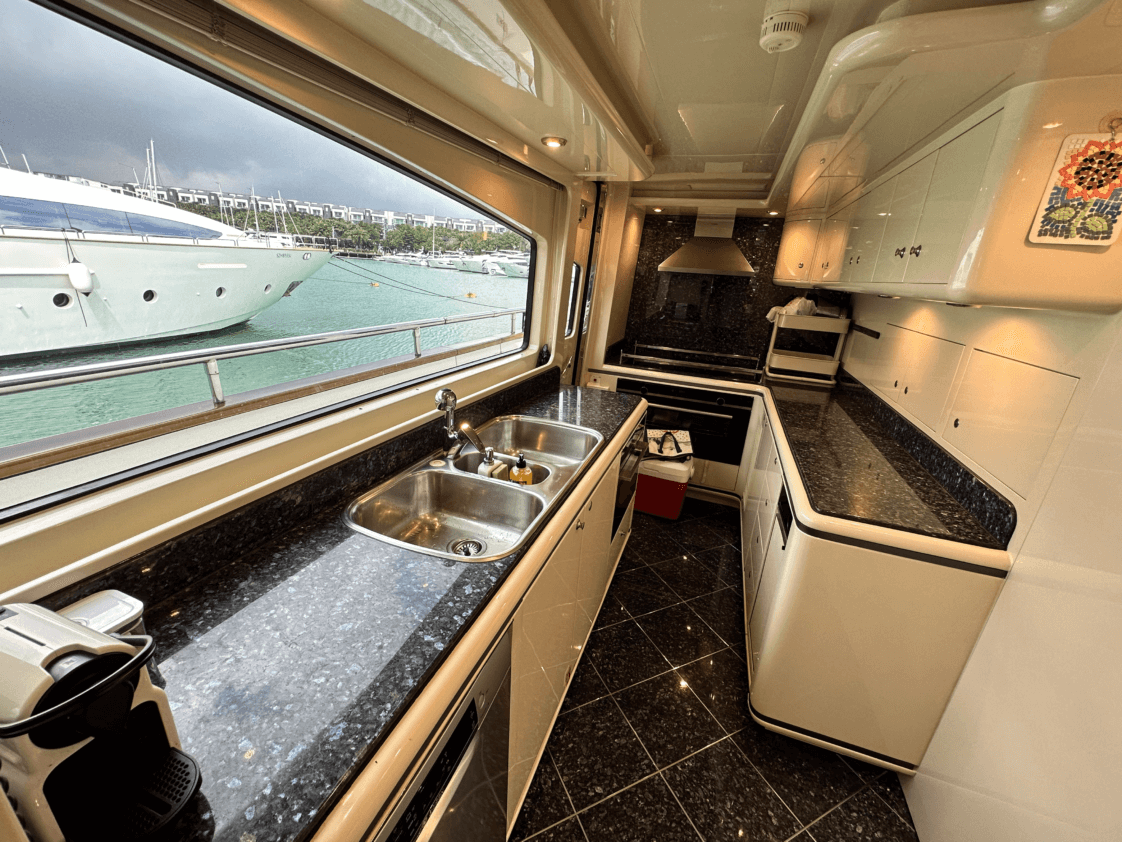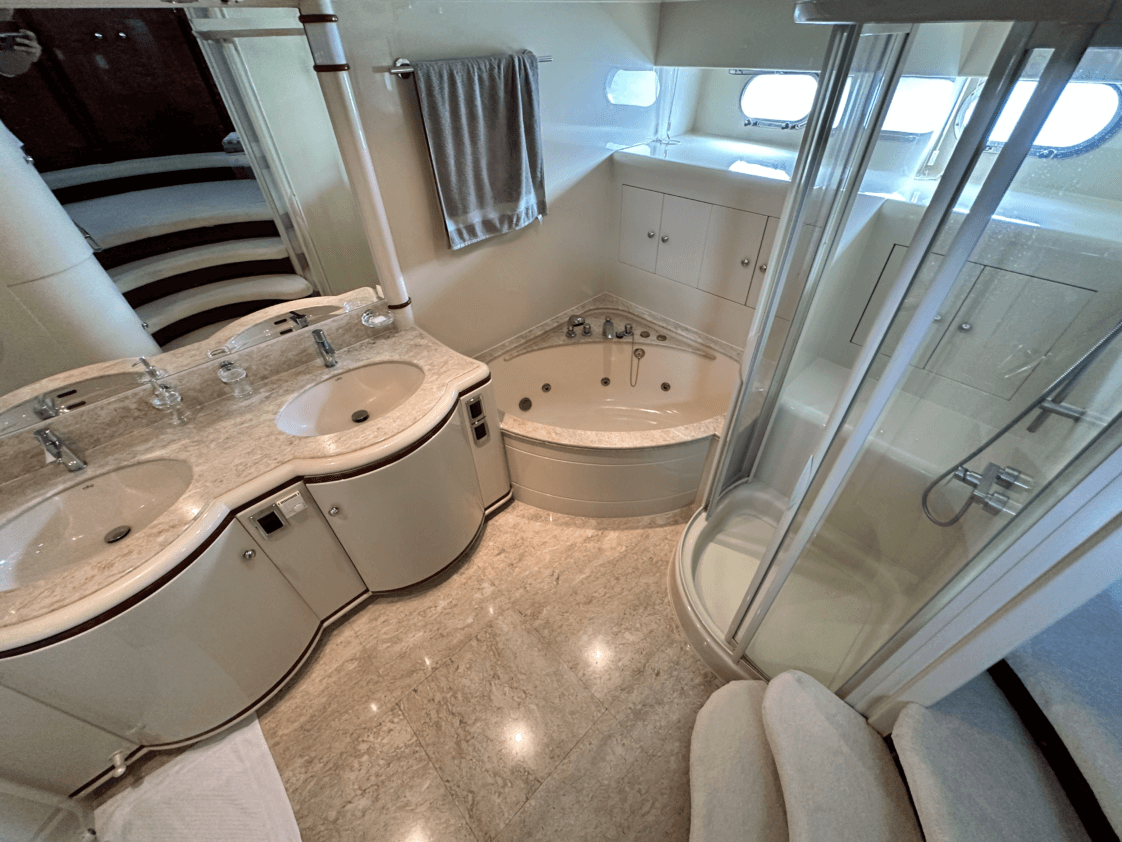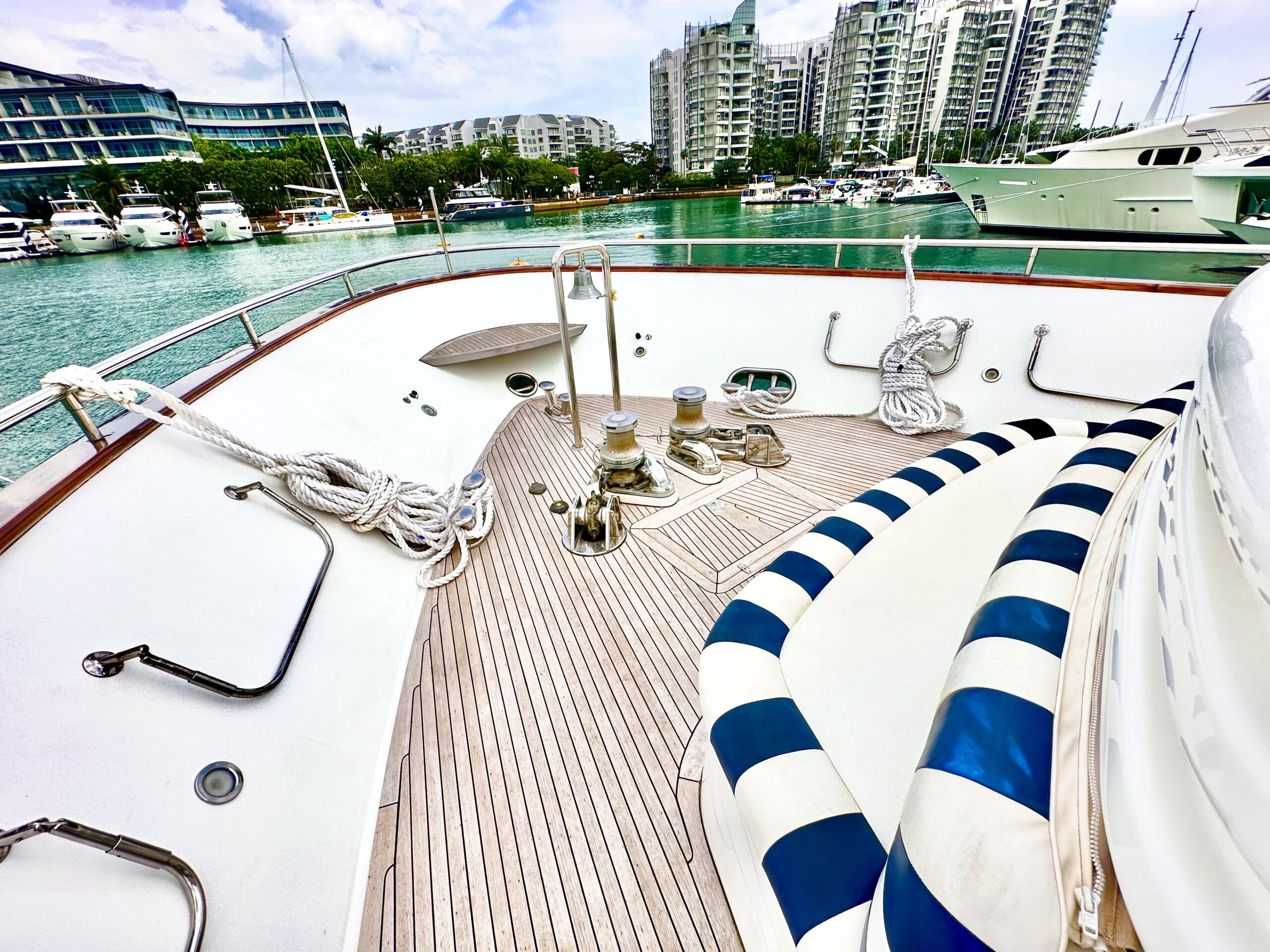 The Leviathan 8 yacht is a 105ft luxury yacht in Singapore boasting a very spacious flybridge to soak up the sun, cruise around Singapore’s sparkling seas, dip in the Jacuzzi, or sit and enjoy the views under the shade. Filled with toys, top quality service provided by her highly-praised and professional crew. Leviathan 8 offers accommodation for up to nine guests in five staterooms. The master stateroom is located forward on the main deck and a curved staircase takes you down to the vanity and large en suite bathroom featuring a Jacuzzi tub and shower.