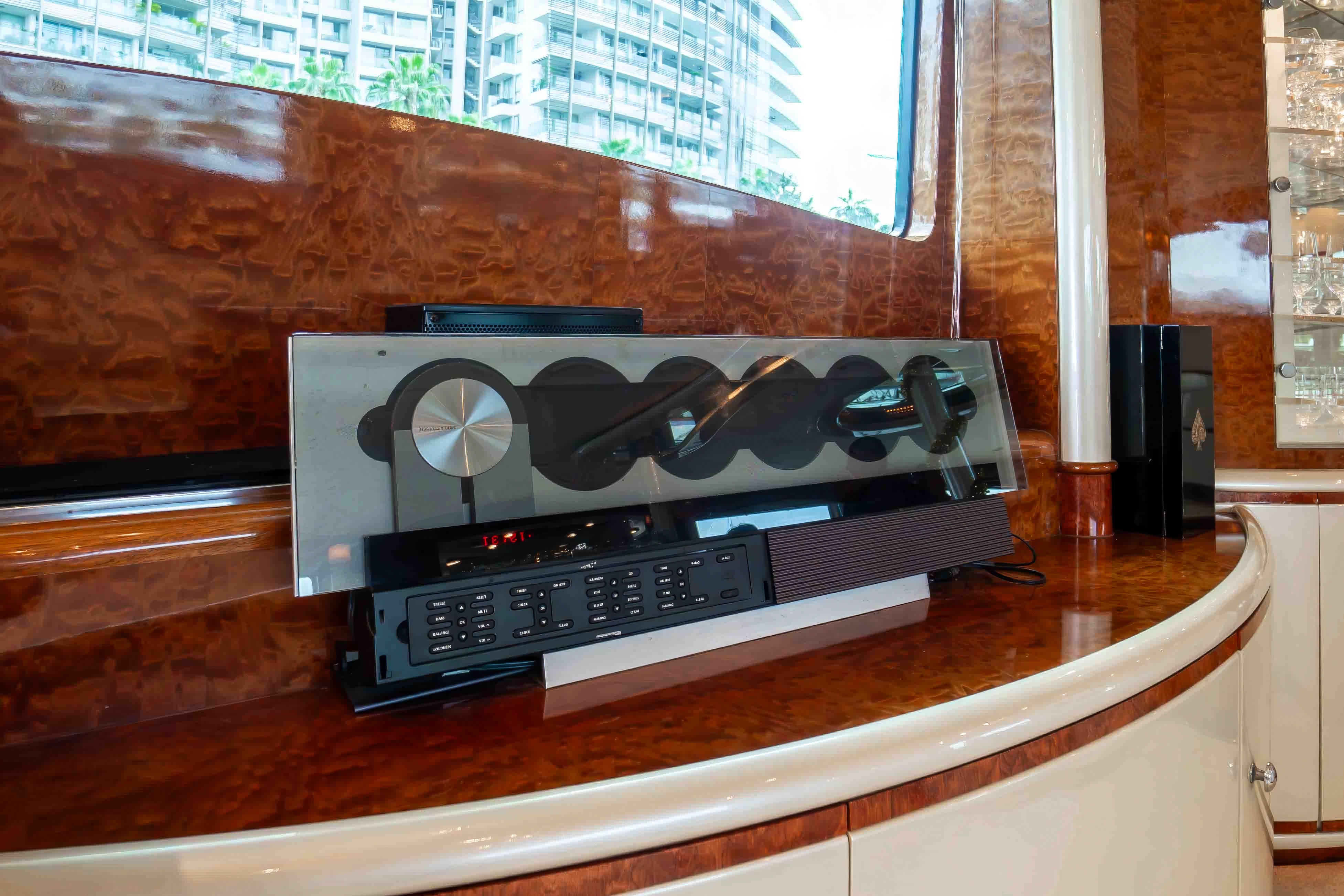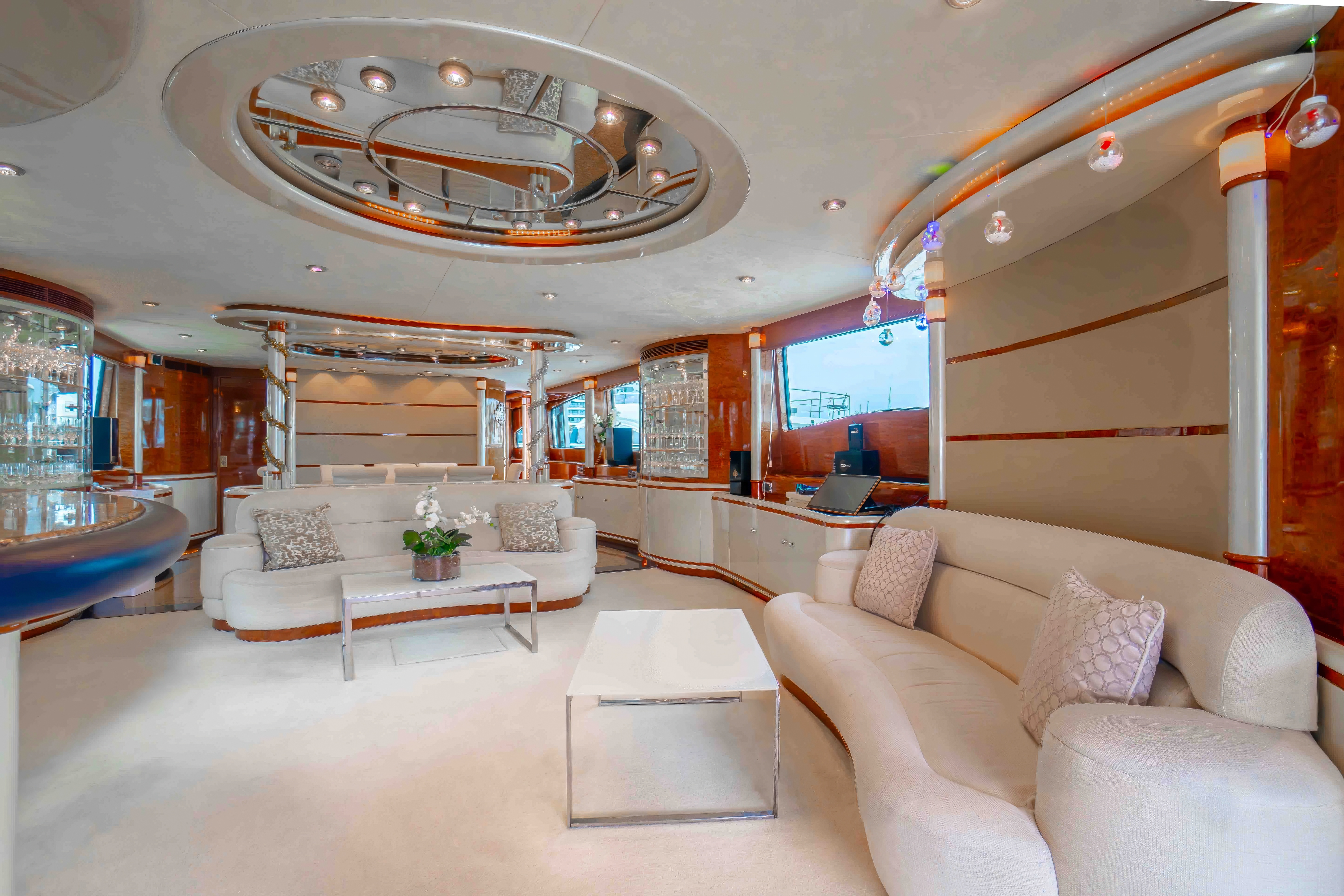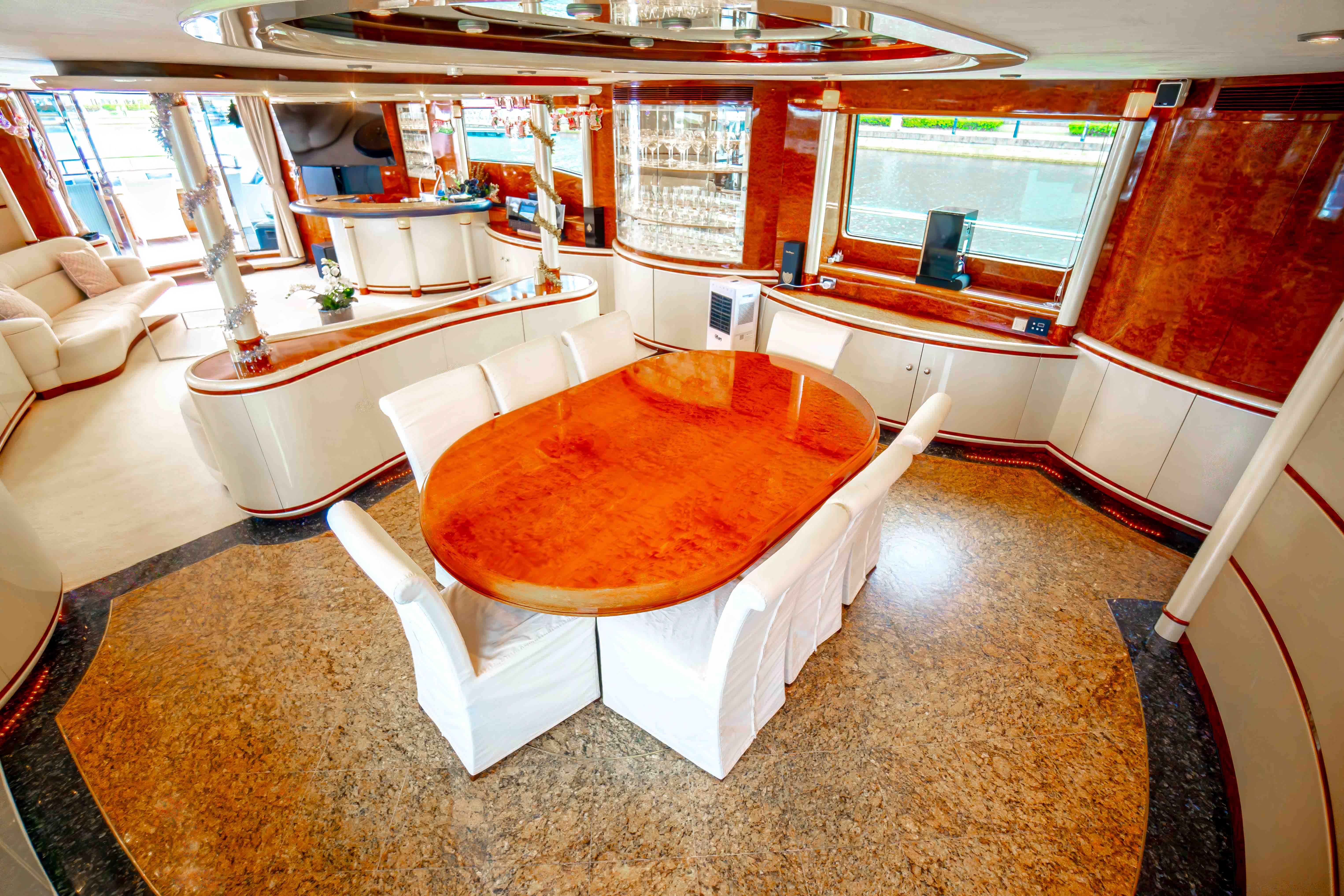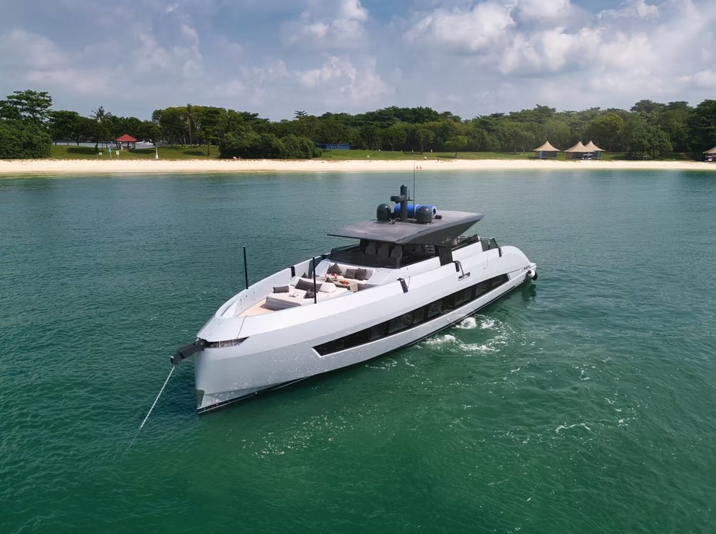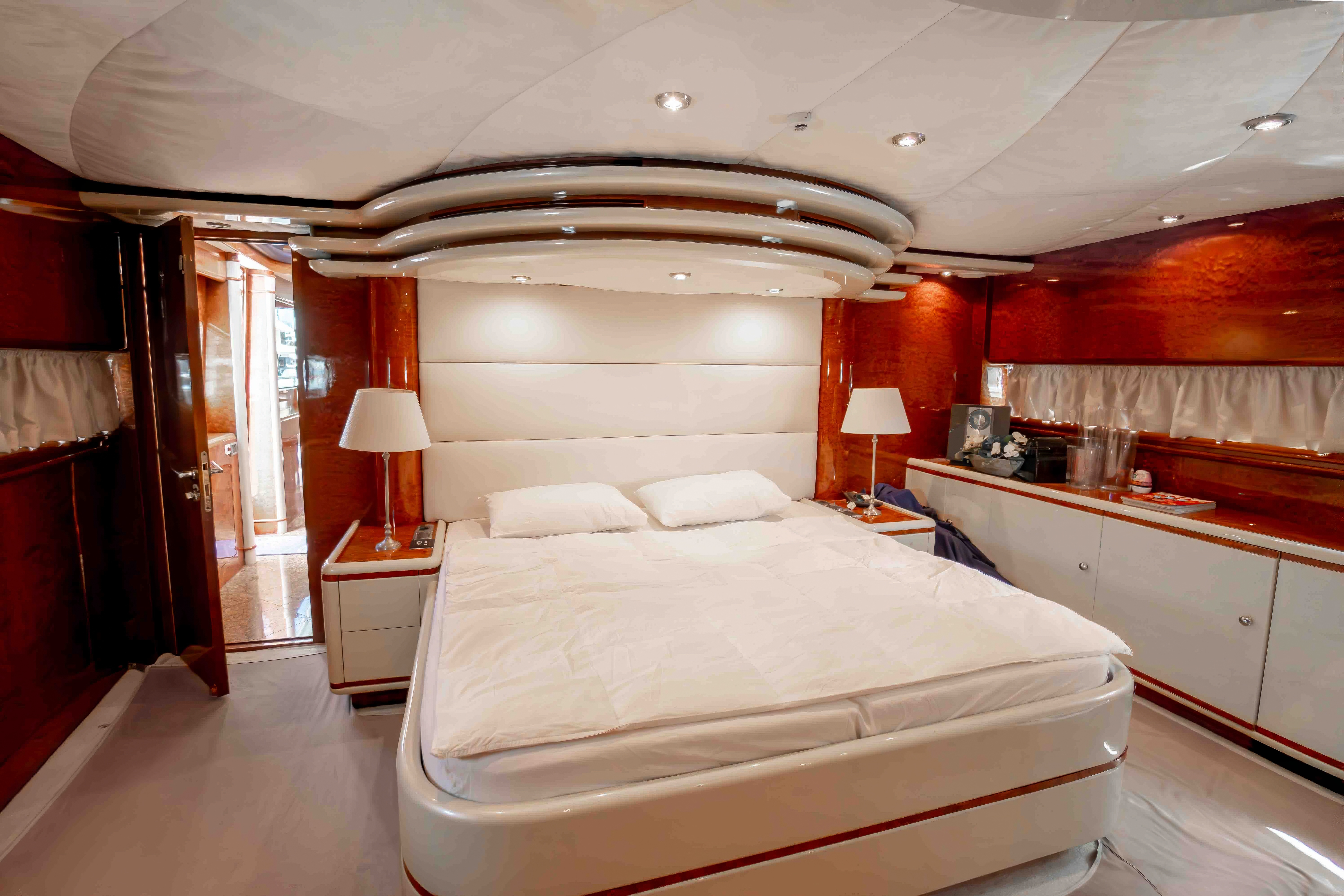 The Leviathan 8 yacht is a 105ft luxury yacht in Singapore boasting a very spacious flybridge to soak up the sun, cruise around Singapore’s sparkling seas, dip in the Jacuzzi, or sit and enjoy the views under the shade. Filled with toys, top quality service provided by her highly-praised and professional crew. Leviathan 8 offers accommodation for up to nine guests in five staterooms. The master stateroom is located forward on the main deck and a curved staircase takes you down to the vanity and large en suite bathroom featuring a Jacuzzi tub and shower.