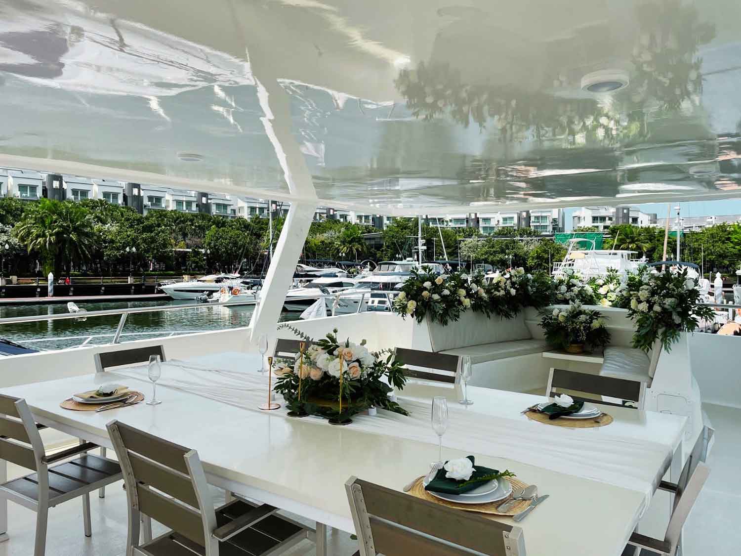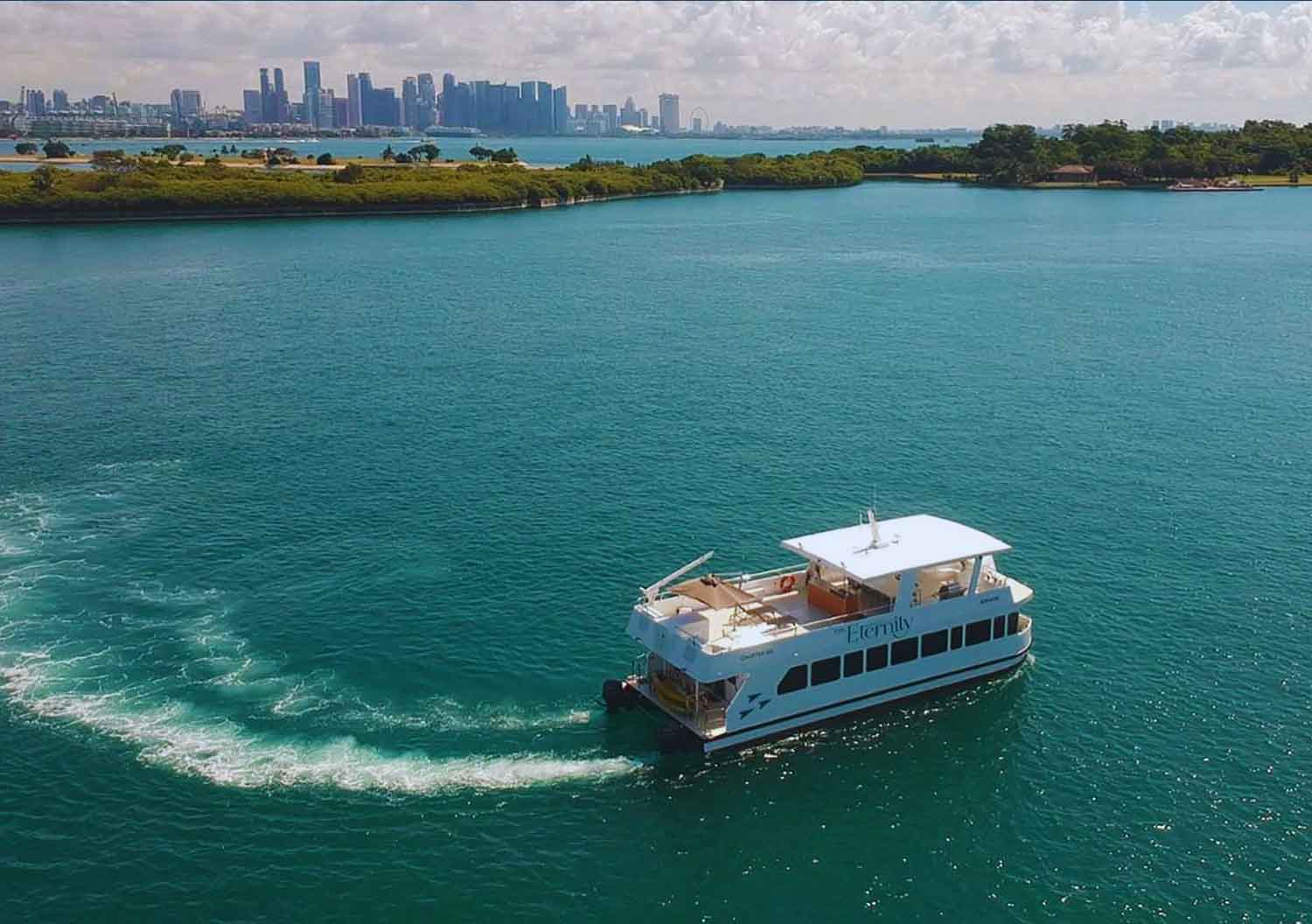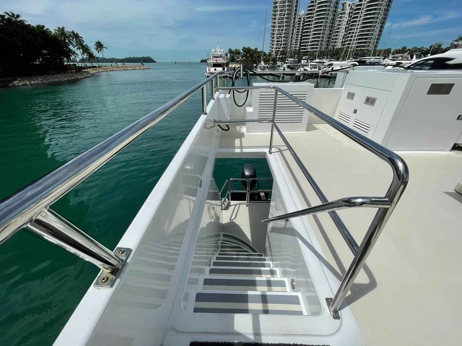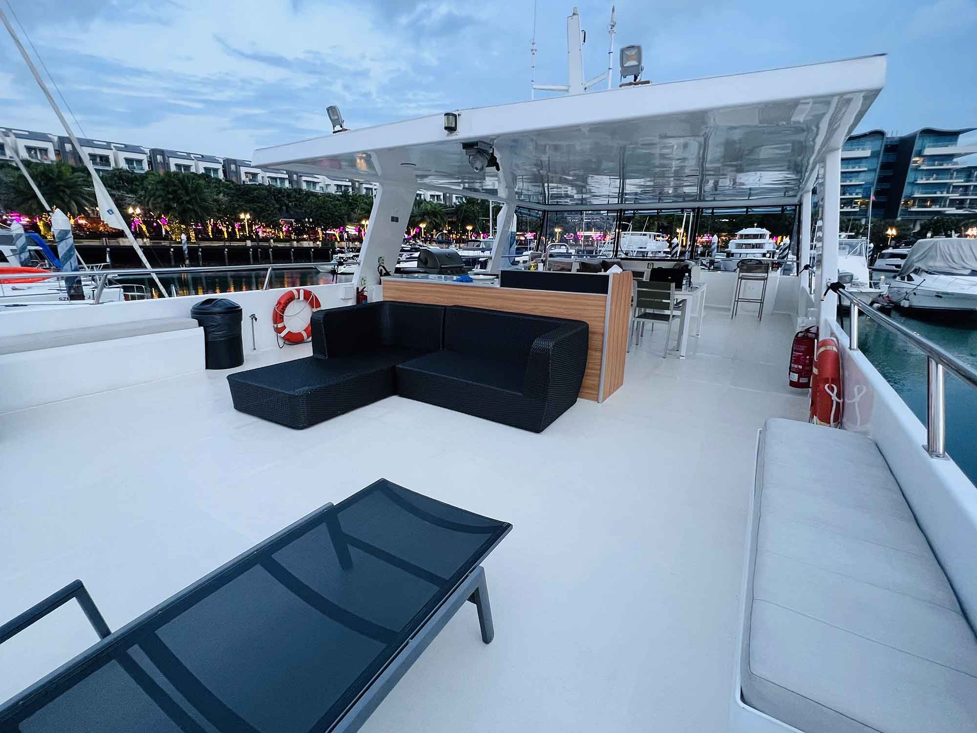 MS Eternity the first charter boat in town with a floating platform concept that brings together music, toys, food, and drink with a distinctly Party Vibe. It features exclusive catering packages from High-Tea, Steamboat, to Barbeque Grill while you enjoy our city’s most exemplary view. We also have fantastic water toys for you and your family before finally relaxing on the vast flybridge to enjoy our outdoor movie. All these, ONBOARD!