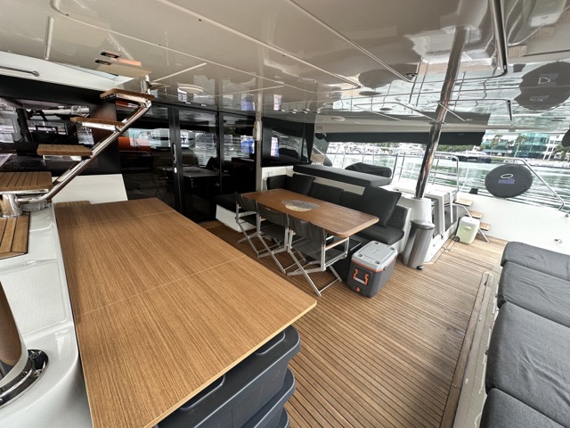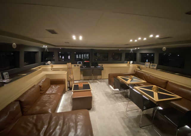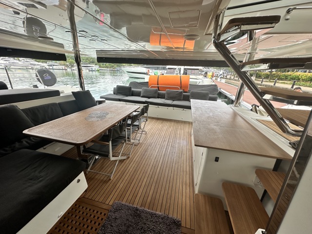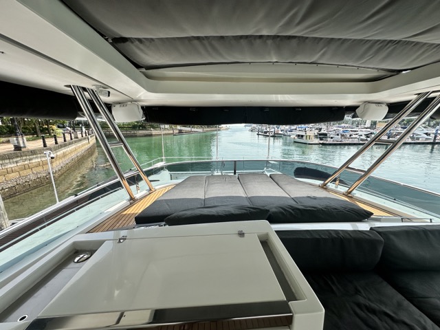 The exterior has plenty of bow and stern space. The stern area is layered with soft seating area, making it a perfect place for a summer drink or dinner. The fly deck is a great area to relax and spend time cruising, with a lot of soft sofas.