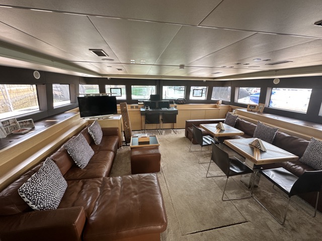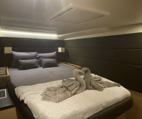 The inside of the boat is layered in all the top line modern materials, resembling a penthouse apartment. As you go further inside, you discover the luxury cabins, a fully equipped functional kitchen, and large separate bathrooms for each cabin.