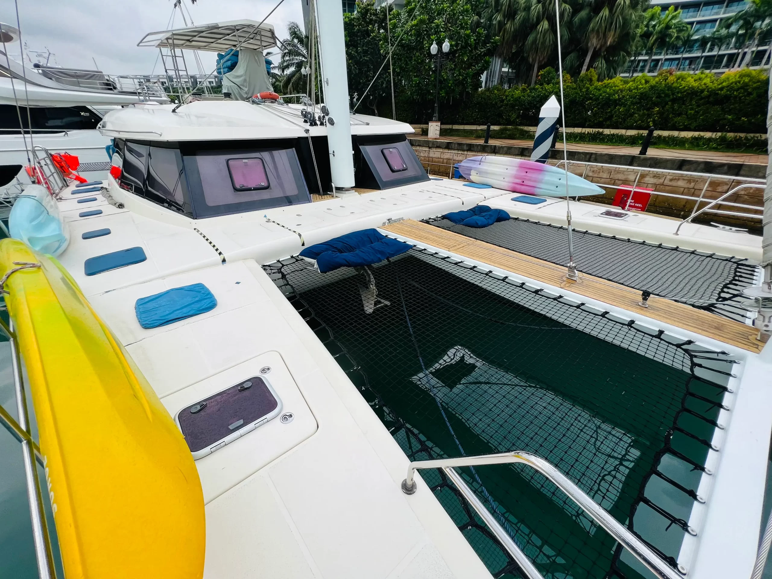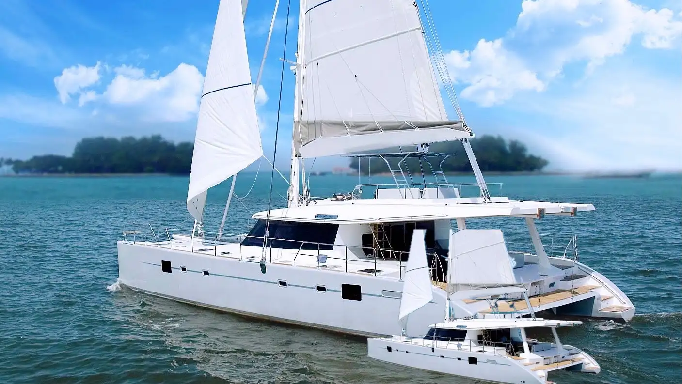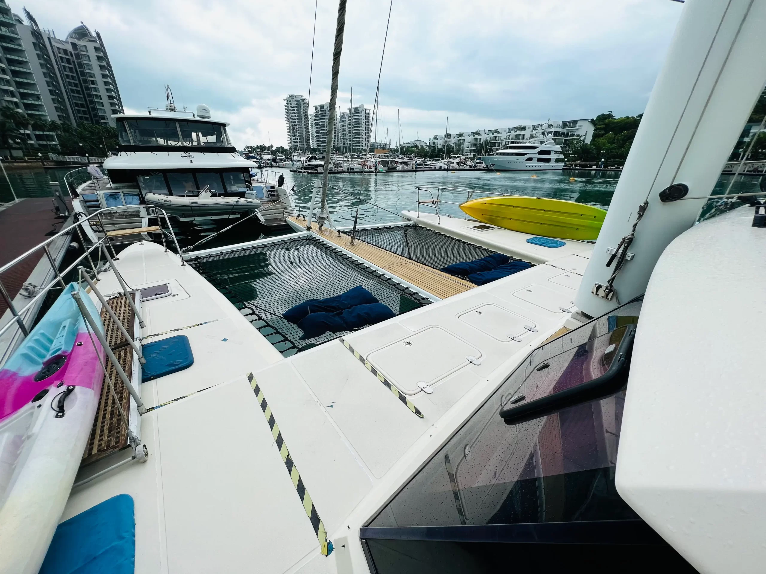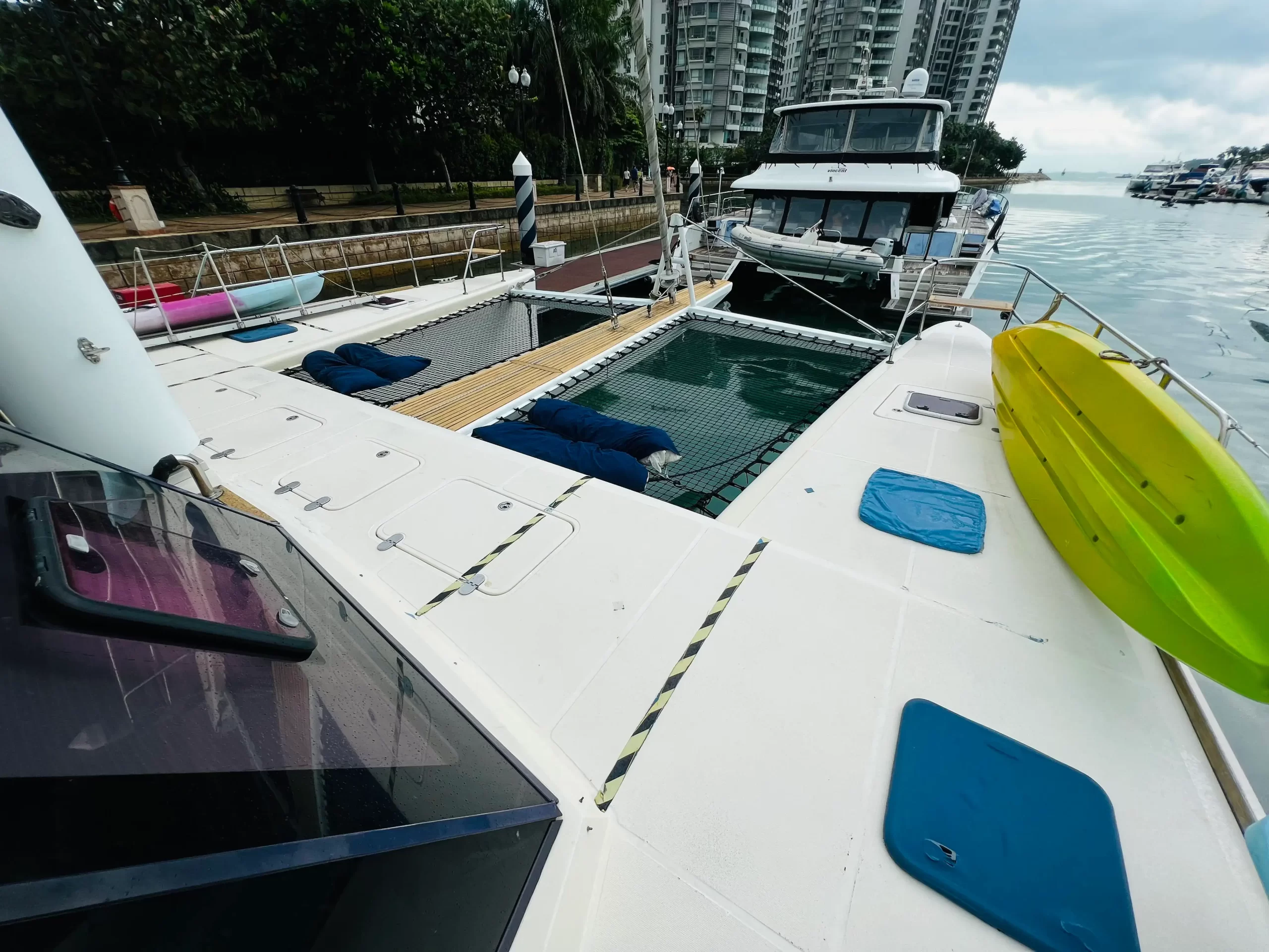 Boasting a spacious deck and luxurious interior, the Sunreef 62 is one of the largest and luxurious of yachts available for charter. This yacht easily hosts entire families, corporate teams. It is even a possible venue hold smaller-scale weddings. At the front of the yacht, you’ll find trampoline netting that spans across the width of the bow–one of the best spots to be to catch that beautiful setting sun in the cooling sea breeze. Inside, you will find a luxurious saloon that leads to multiple cabins. The saloon is fully equipped with hardware to fulfill whatever multimedia requirements your occasion may require. There is also a mini-bar amidst the various kitchen appliances that you will find in the lounge.