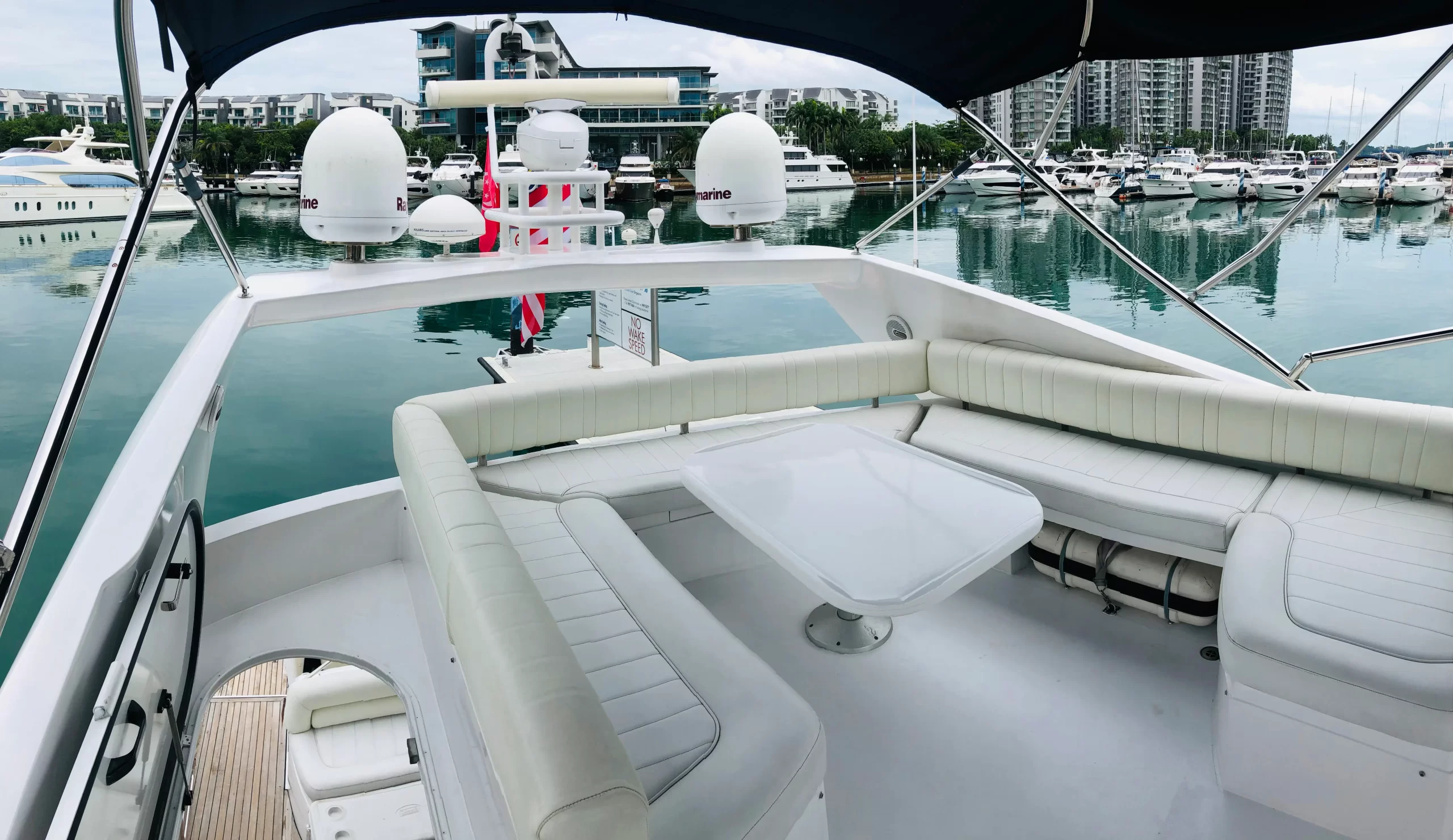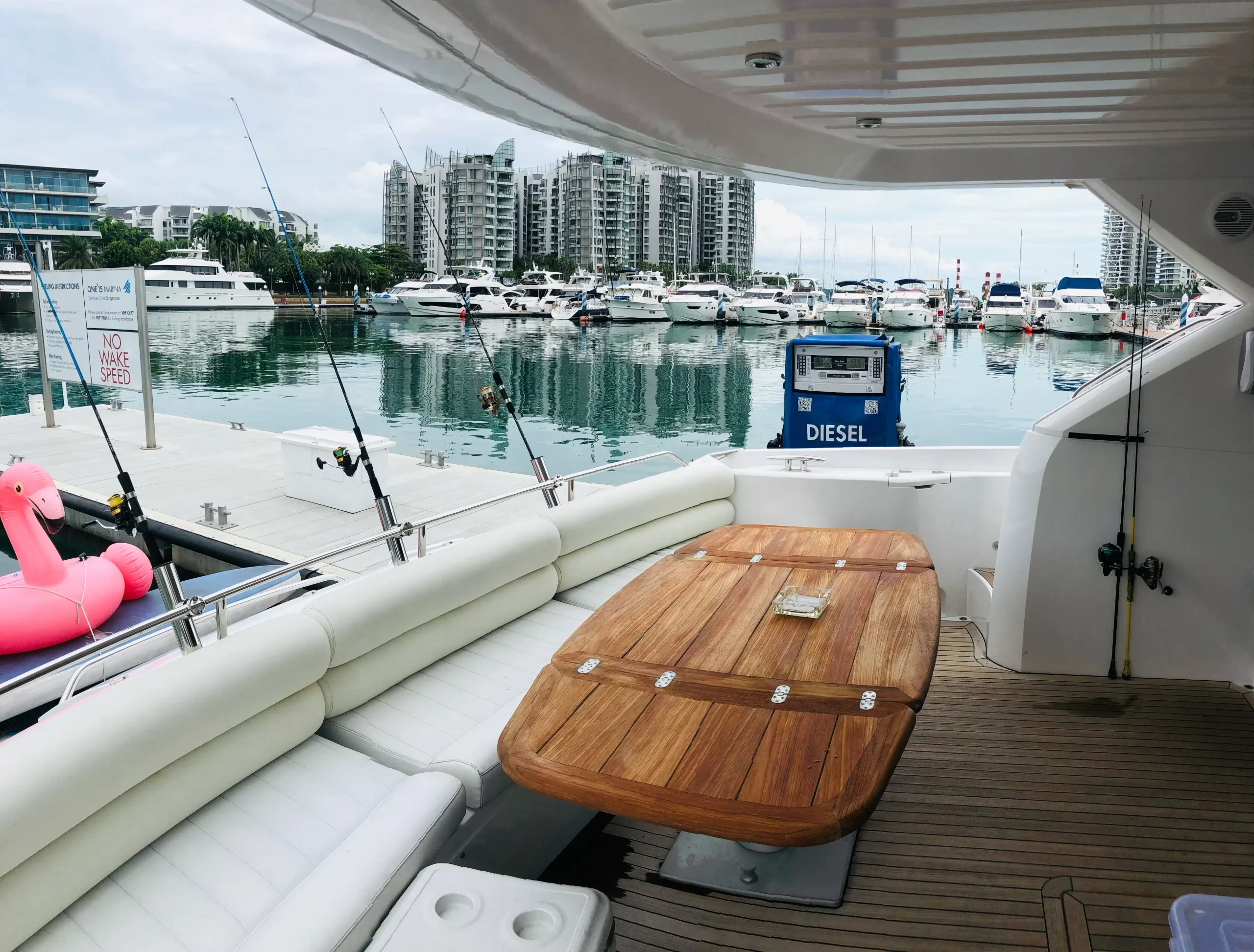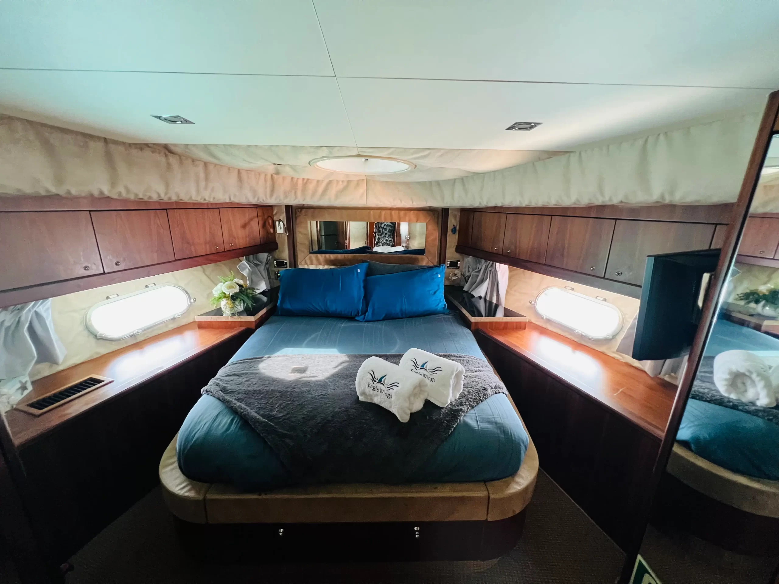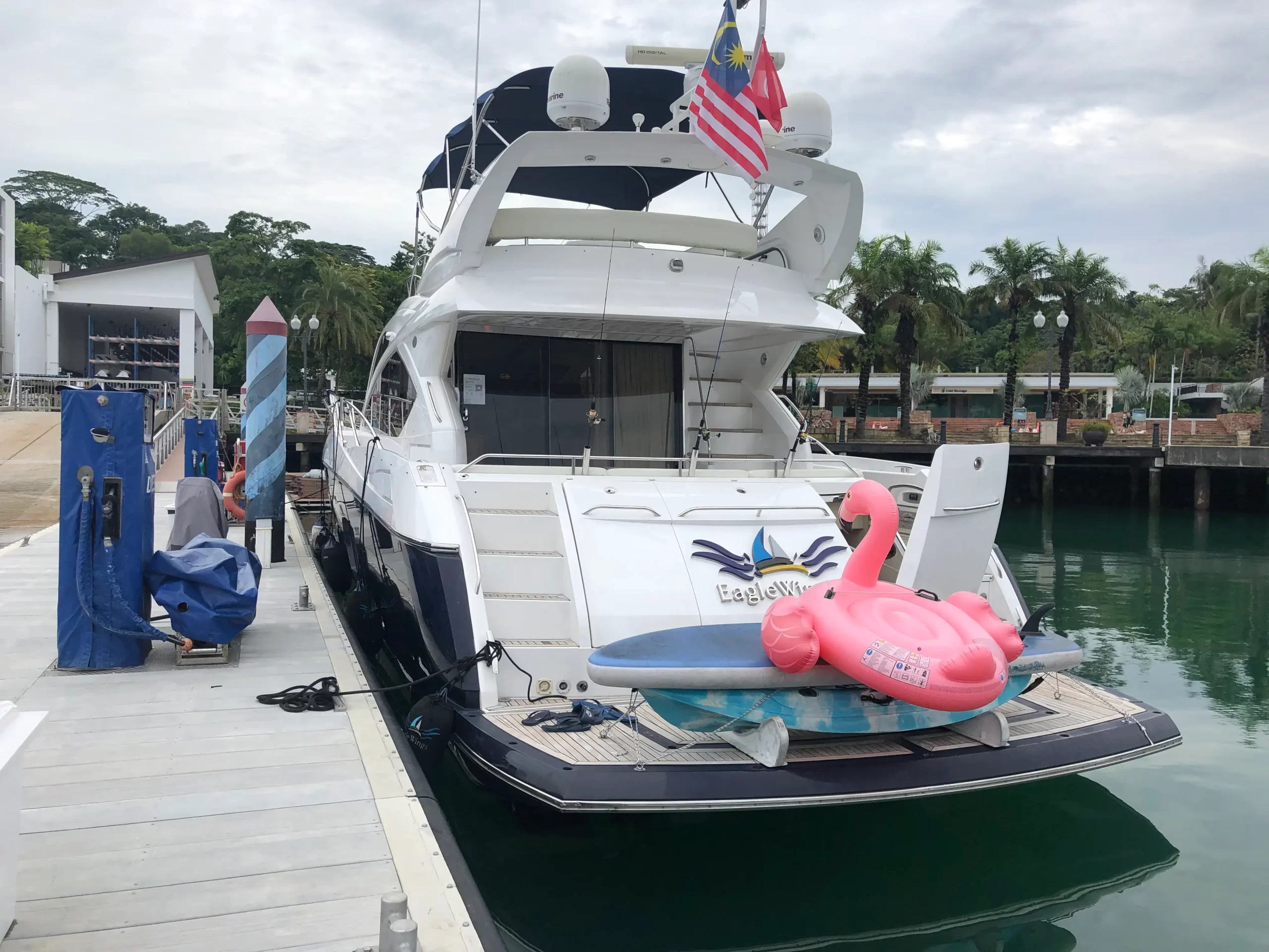 Eaglewings II is easily one of the most popular choices for smaller parties. Its spatial efficiency on board make it one of the best in the size tier, perfect for charters going for a more cosy feel. Host your family on one of the more luxurious yachts available for your next gathering; or take your friends for a chill evening out at sea as you clink glasses watching the setting sun over the horizon. Boasting 3 cabins which are home to 2 queen sized beds along a single bed, Eaglewings II is a perfect choice for that staycation with that special someone you have in mind. Or even take the romance up a notch by planning a romantic dinner out at sea using the dining facilities on board. Eaglewings II is the sibling yacht to Eaglewings I. Smaller in size but still maintaining the luxurious space on board-she can easily host 15 guests with ample space for everyone.