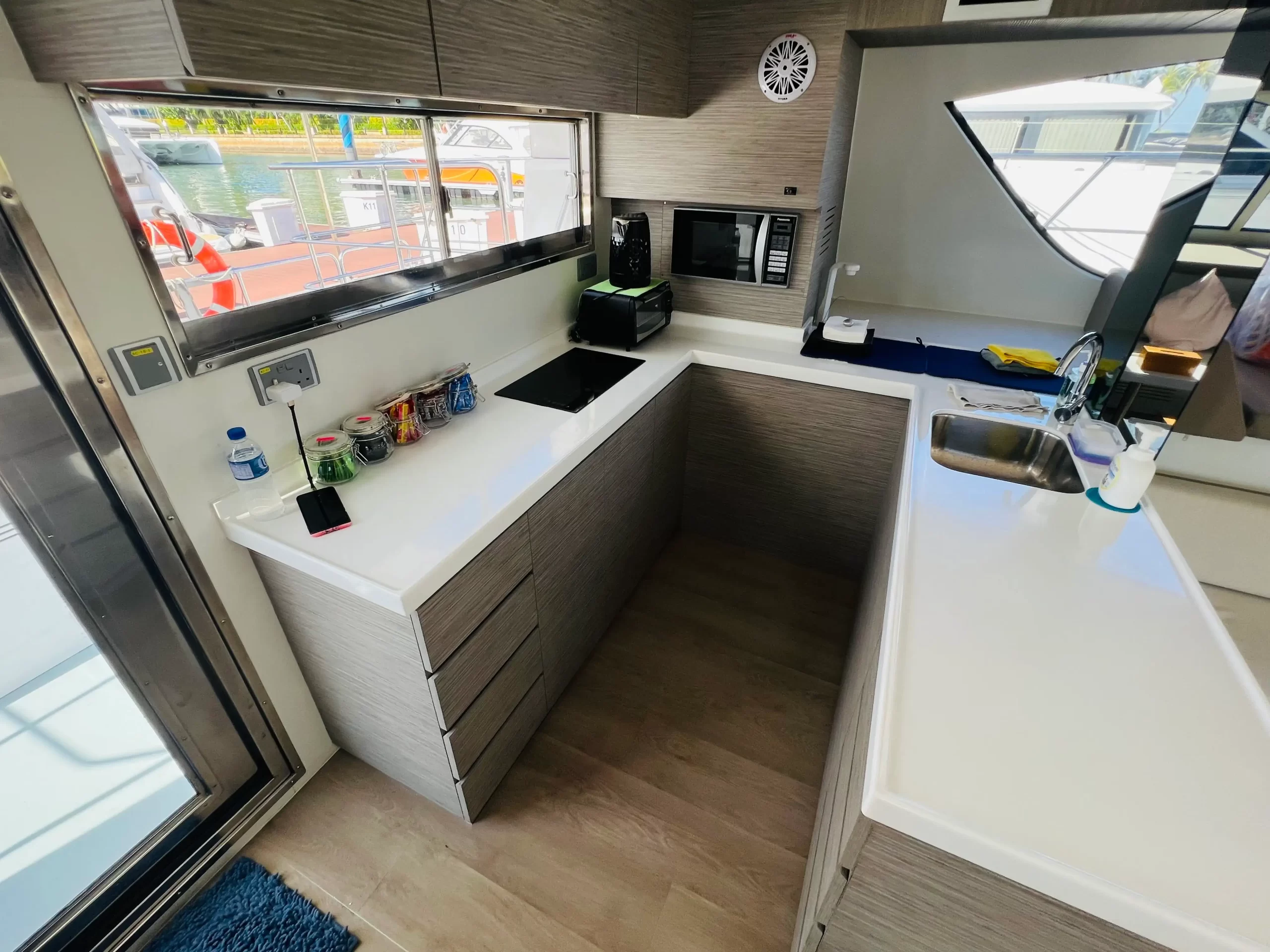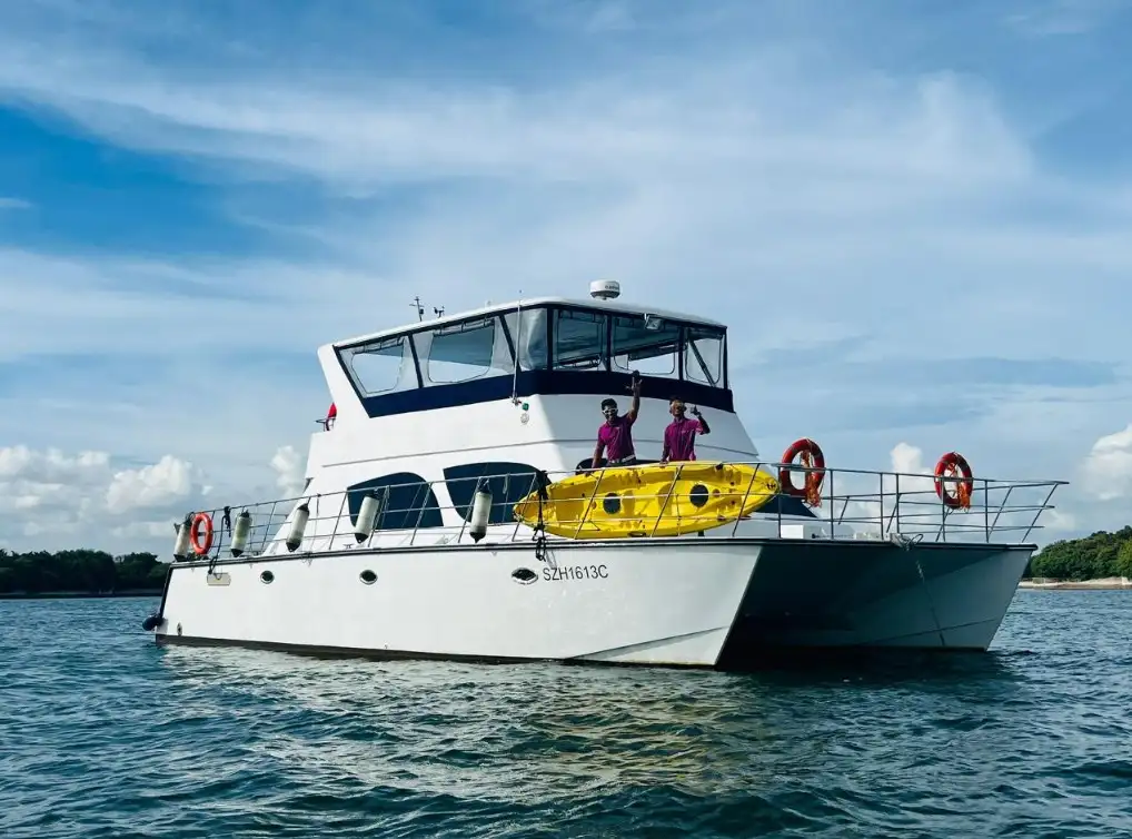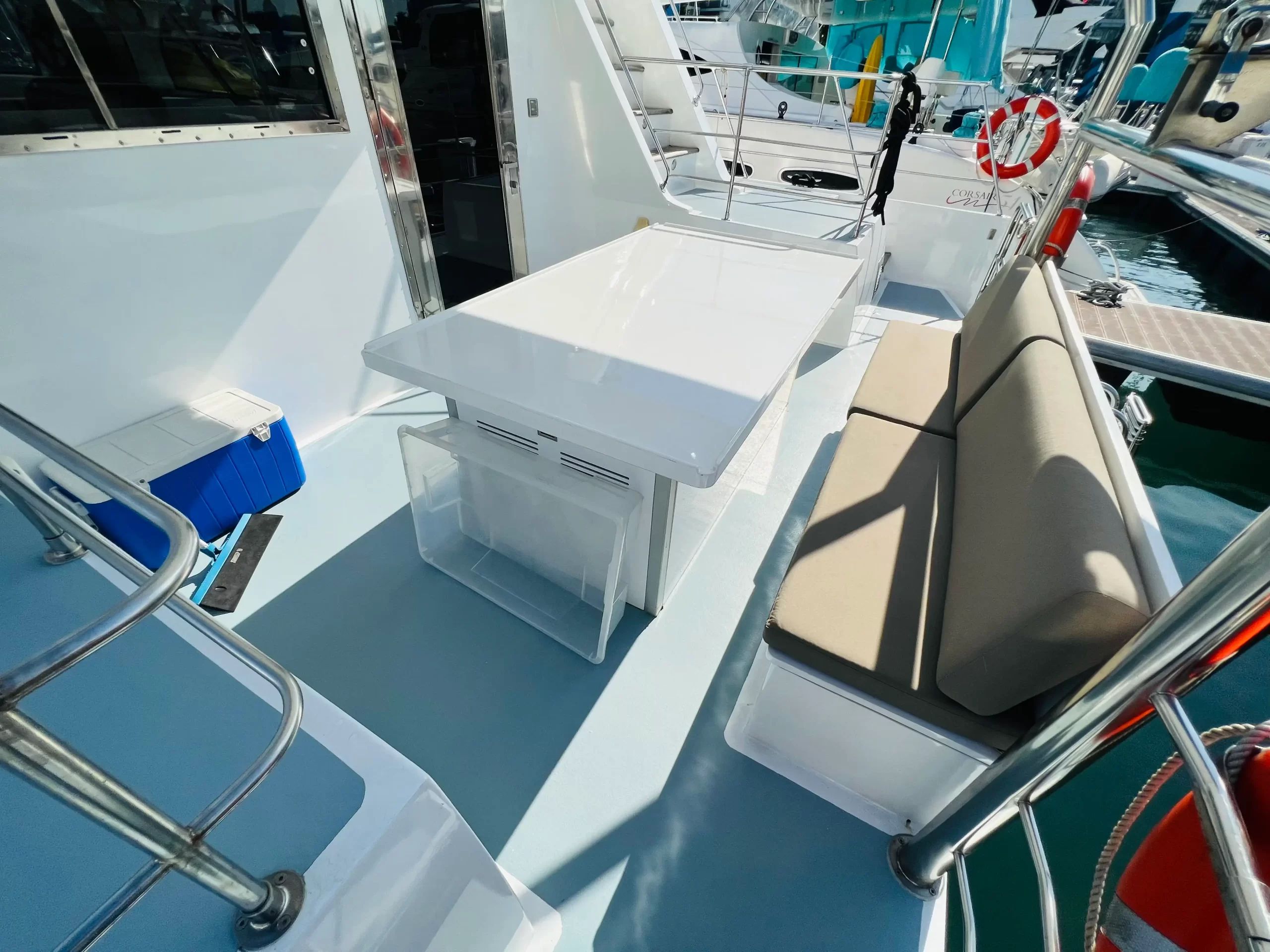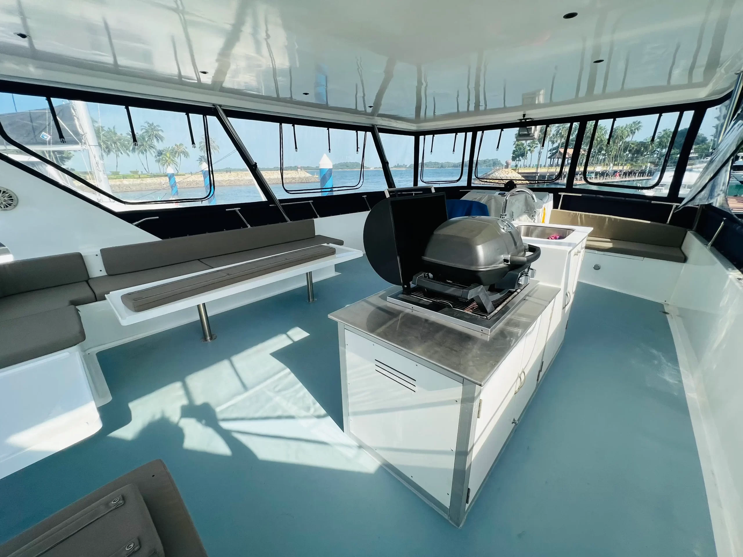 It’s a beautiful power catamaran which is licensed for up to 42 guests. It boasts of panoramic windows with a huge indoor saloon and an equally huge flybridge which can easily seat 15-20 pax. The yacht is also equipped with a full surround sound and karaoke system. Very suitable for large groups and corporates.