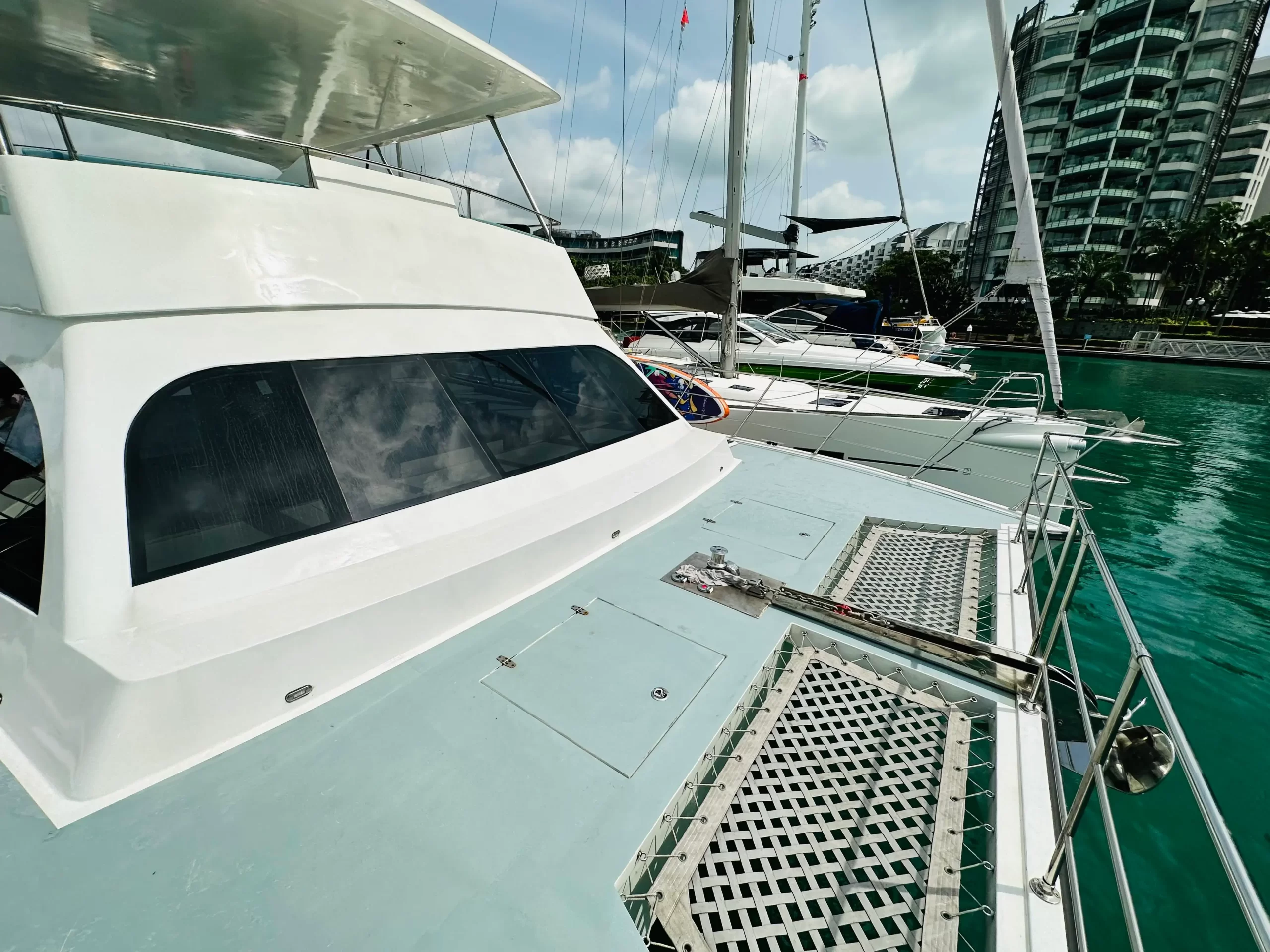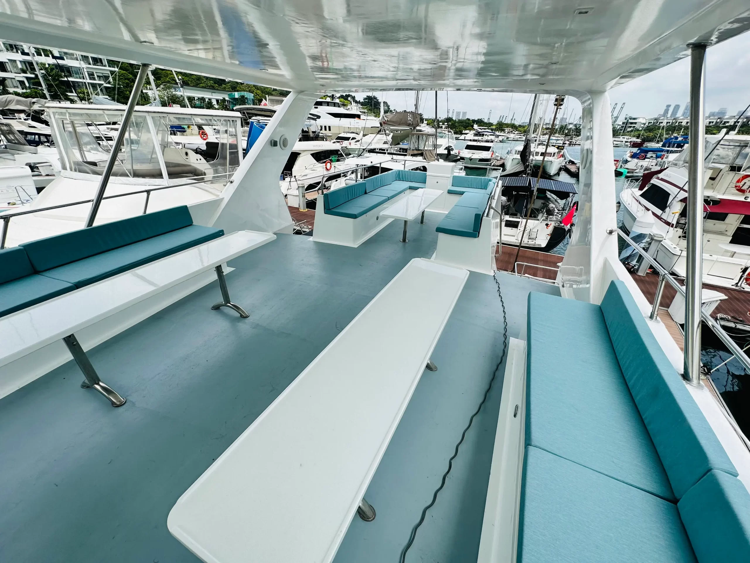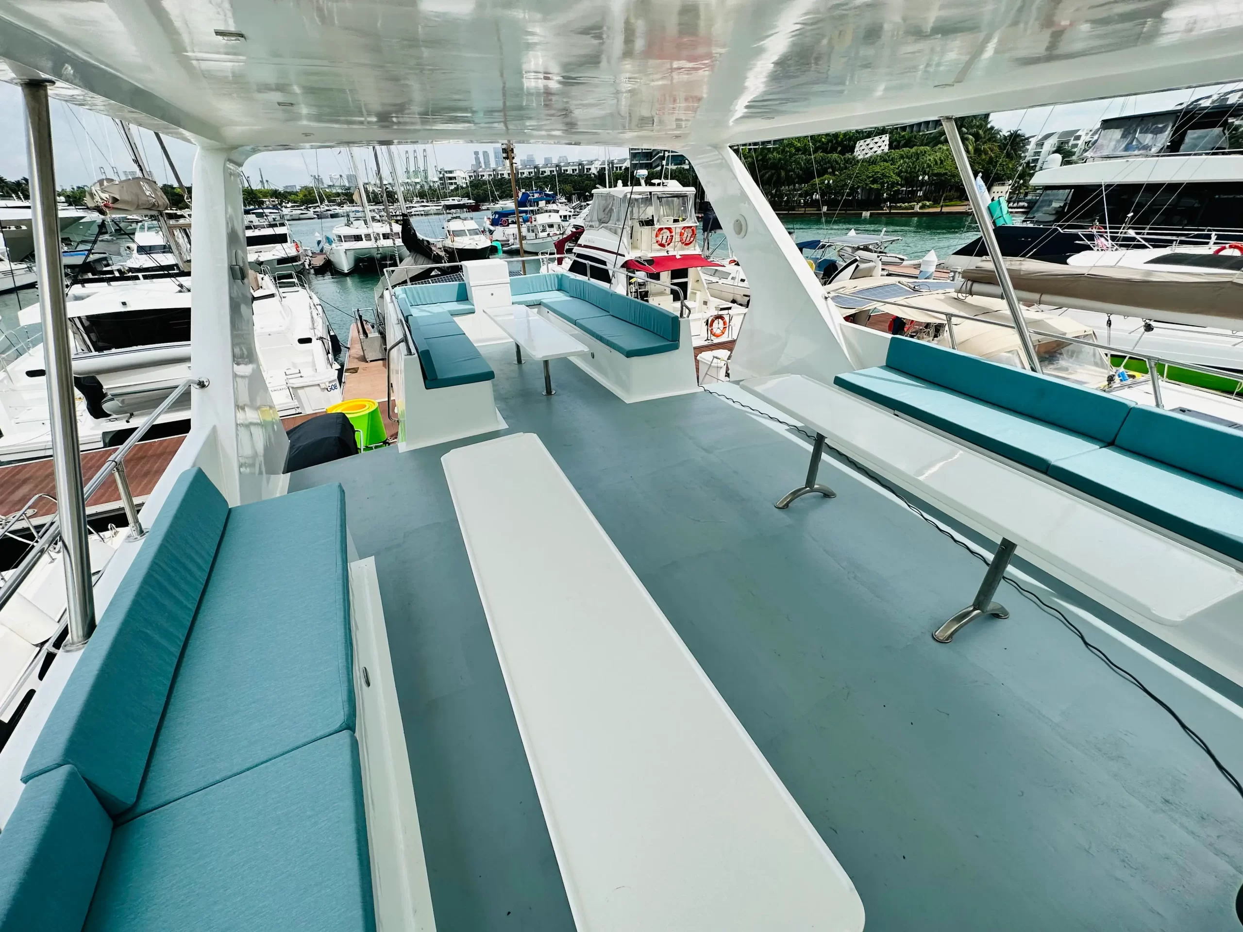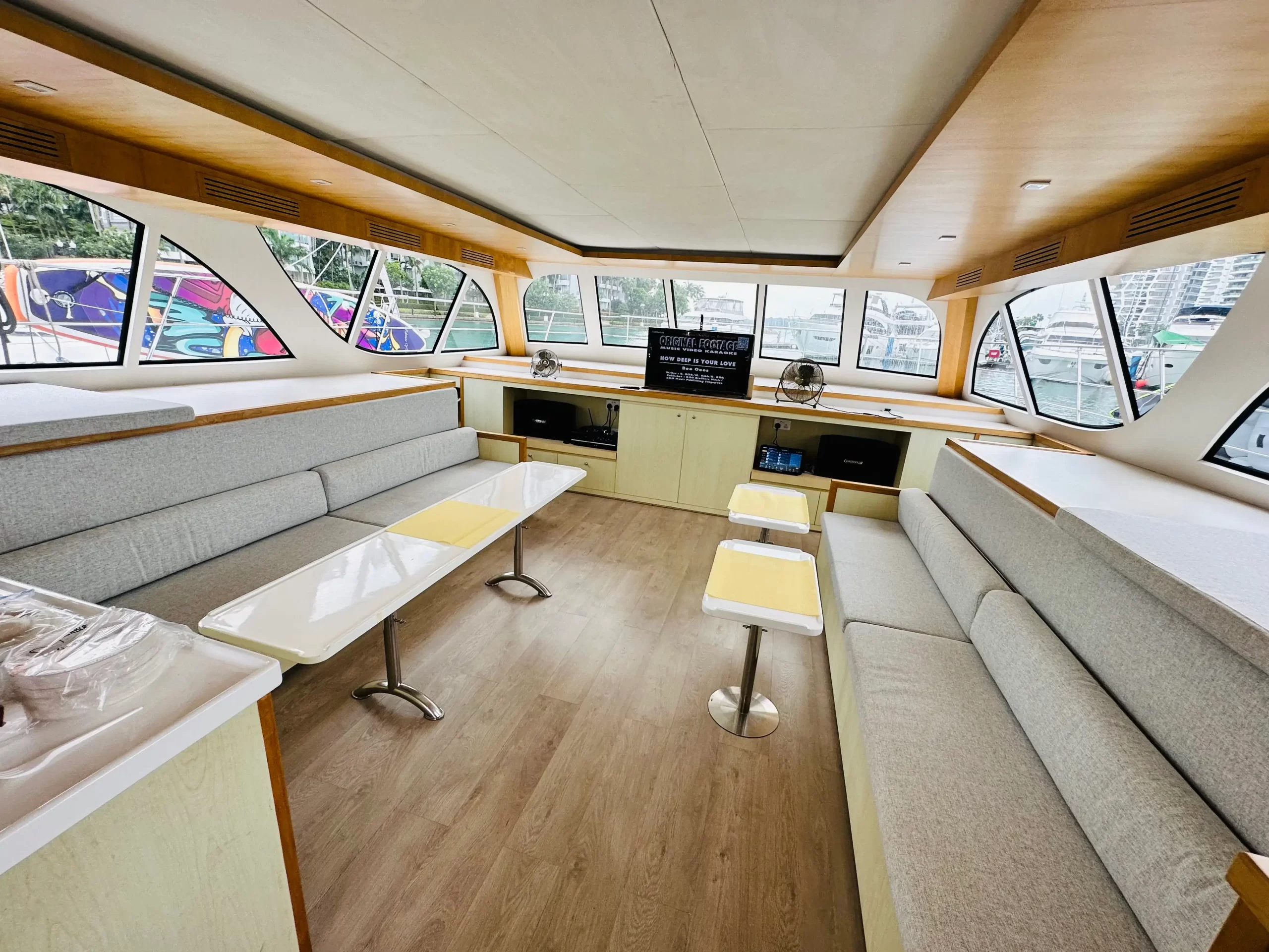 It’s a beautiful power catamaran which is licensed for up to 42 guests. It boasts of panoramic windows with a huge indoor saloon and an equally huge flybridge which can easily seat 15-20 pax. The yacht is also equipped with a full surround sound and karaoke system. Very suitable for large groups and corporates.